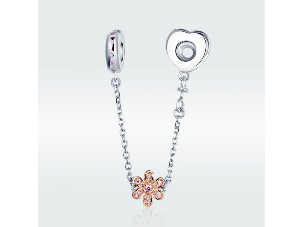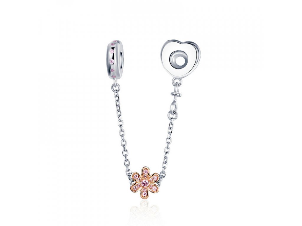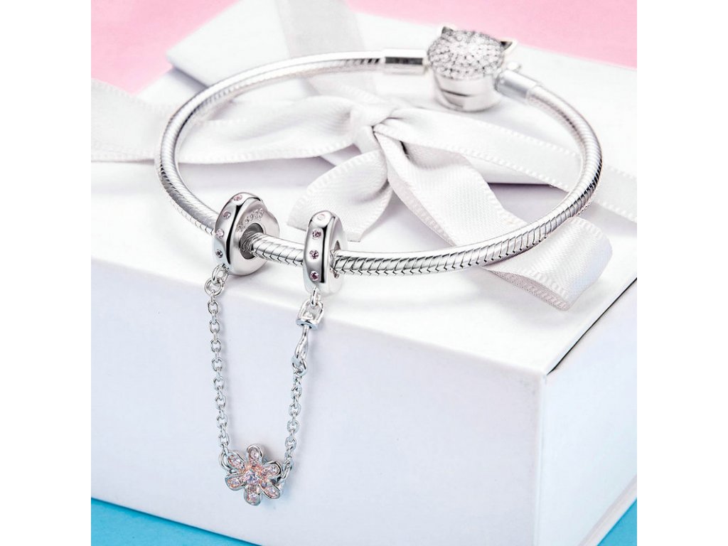 Stříbrný bezpečnostní řetízek je zdobený třpytivými zirkony a přívěskem květiny. Řetízek má dekorativní ale i praktickou funkci, navlékne se na konec Vašeho náramku a tím chrání Vaše přívěsky a korálky před ztrátou. Originální design řetízku, kvalitní zpracování a materiál, ručně dohotovené.