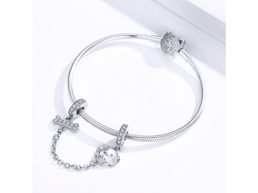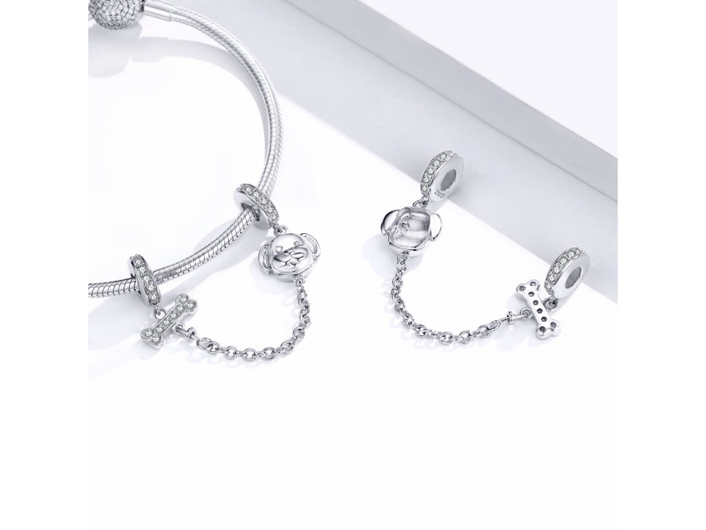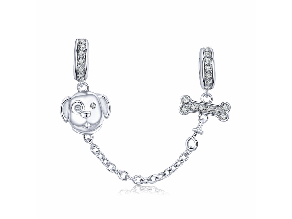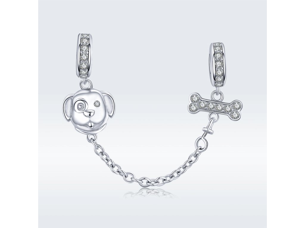 - Stříbrný propracovaný bezpečnostní řetízek na náramek v designu Pejska a kostičky zdobený čirými třpytivými zirkony. Originální design prstenu, kvalitní zpracování a materiál, ručně dohotovené.