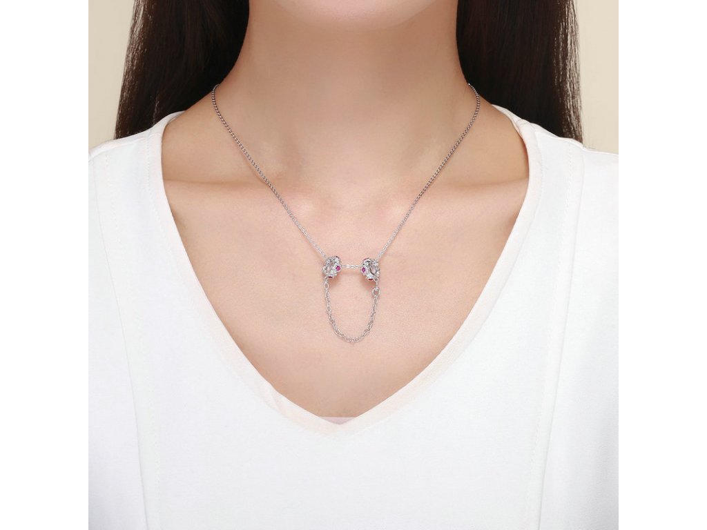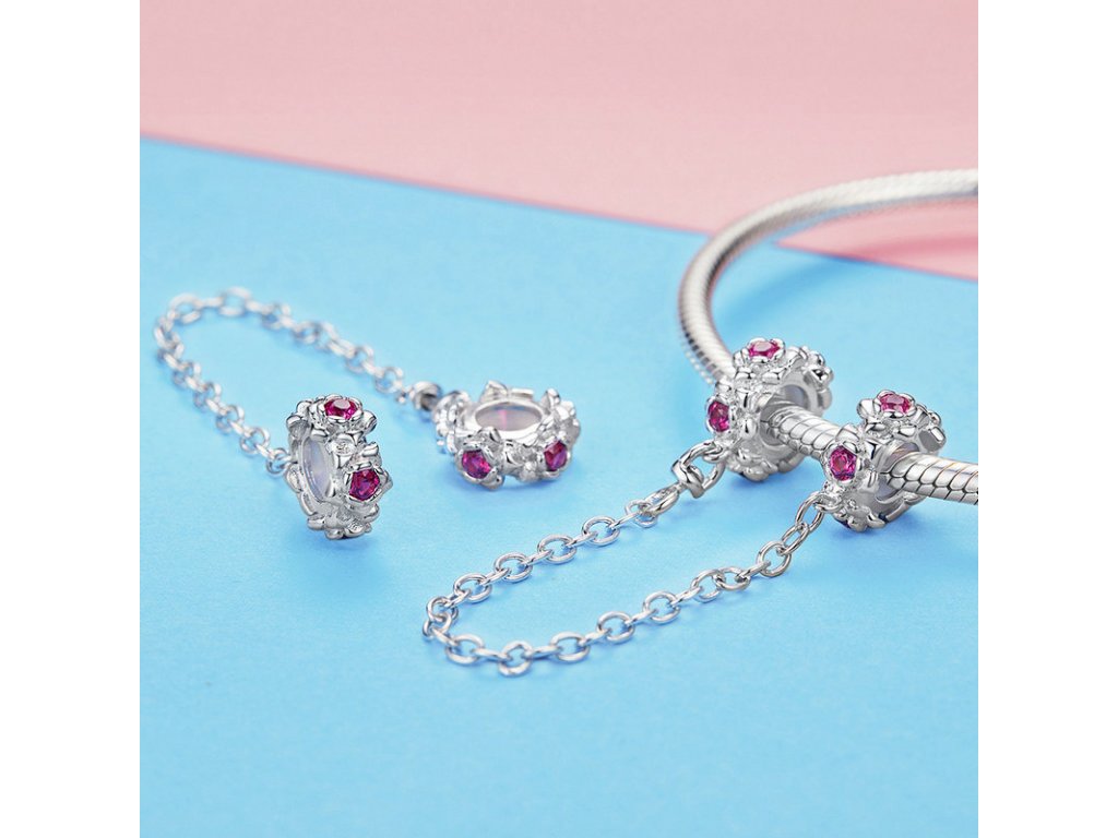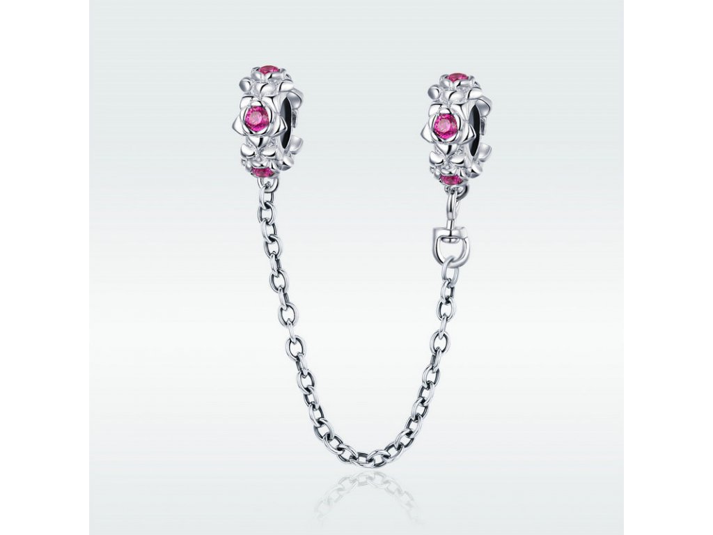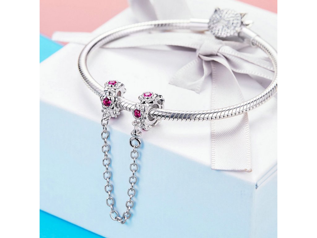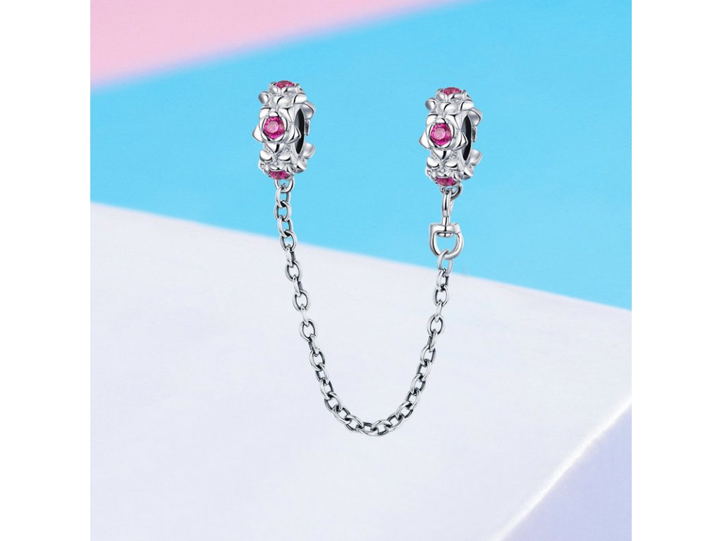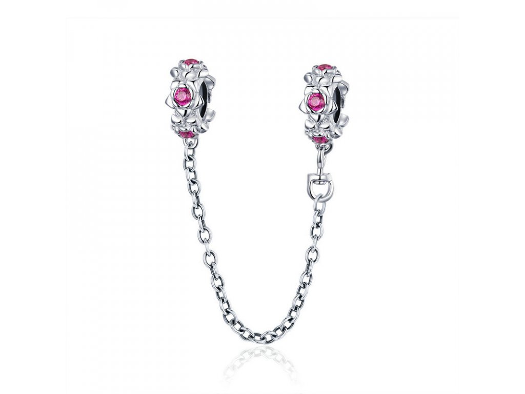 - Stříbrný bezpečnostní řetízek je zdoben romantickými květinami s růžovými zirkony. Řetízek má dekorativní ale i praktickou funkci, navlékne se na konec Vašeho náramku a tím chrání Vaše přívěsky a korálky před ztrátou. Originální design řetízku, kvalitní zpracování a materiál, ručně dohotovené.