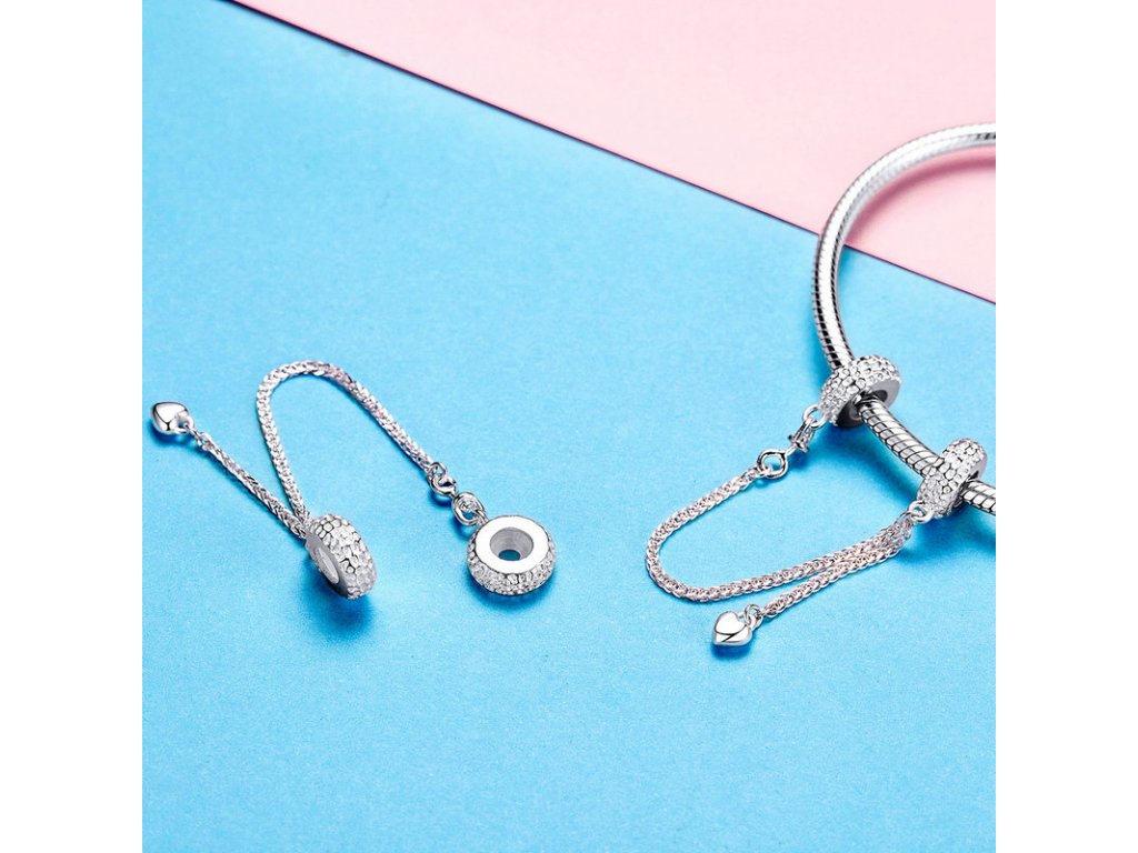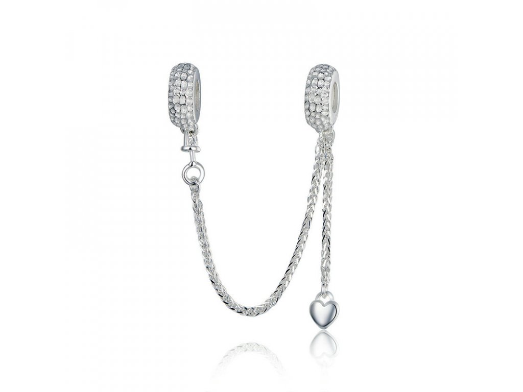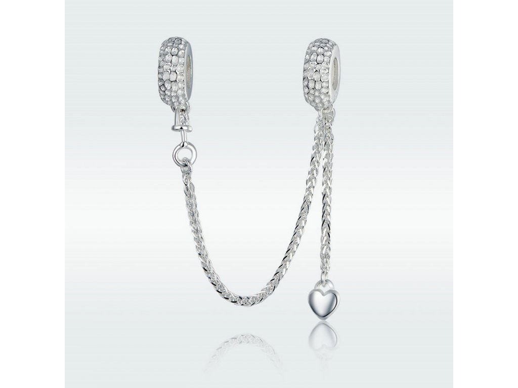 Stříbrný bezpečnostní řetízek je zdobený třpytivými zirkony a přívěskem srdce. Řetízek má dekorativní ale i praktickou funkci, našroubuje se na konec Vašeho náramku a tím chrání Vaše přívěsky a korálky před ztrátou. Originální design řetízku, kvalitní zpracování a materiál, ručně dohotovené.