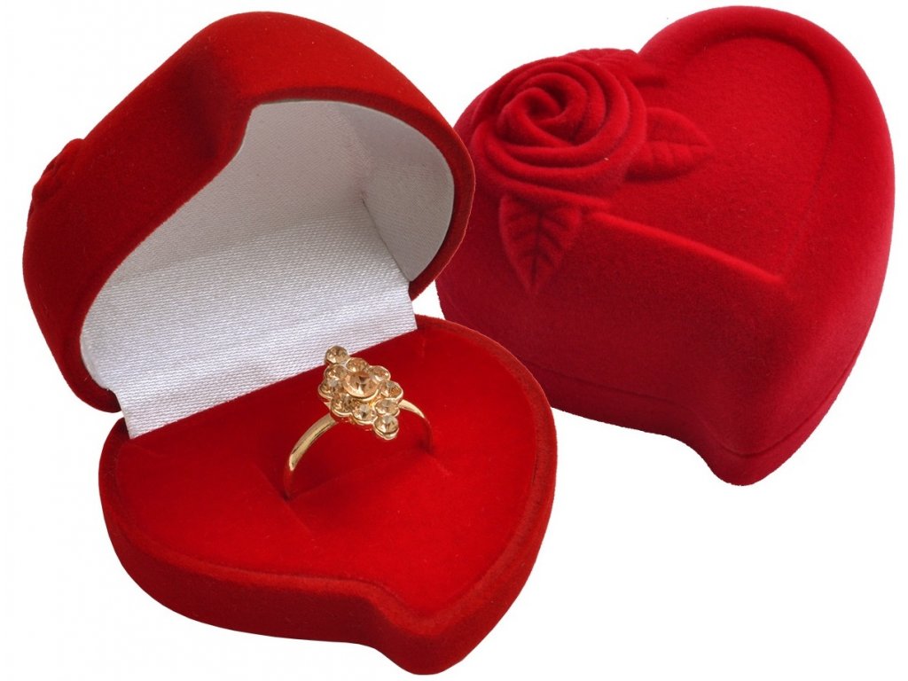 - Červená sametová dárková krabička ve tvaru srdce s motivem růže.