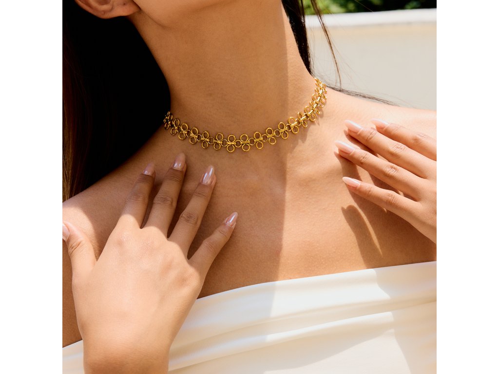 ELENYS Aurelia Loop je choker, který stojí na detailu – jemná očka připomínají drobné květy a vytváří efekt sofistikované textury. Působí moderně, ale zároveň nadčasově – přesně ten typ šperku, který „udělá“ celý outfit jedním tahem.