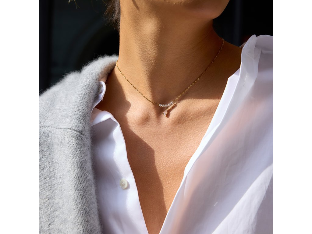 Zirkony jemně zachycují světlo a vytvářejí měkký, elegantní třpyt, který zvýrazňuje dekolt, aniž by působil okázale. Kapkový tvar dodává šperku lehký pohyb a přirozenou dynamiku.