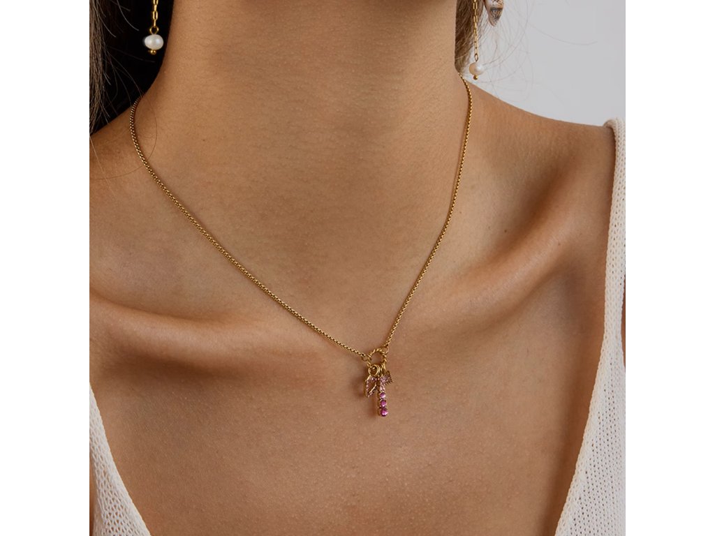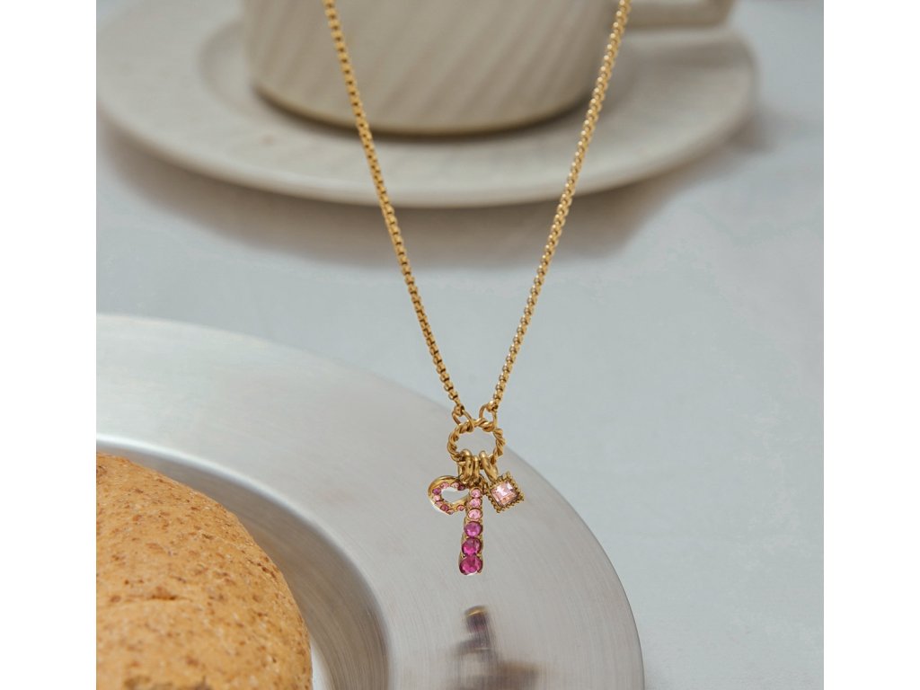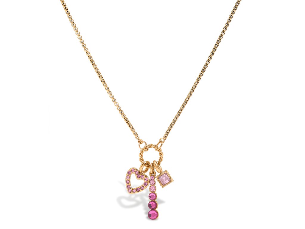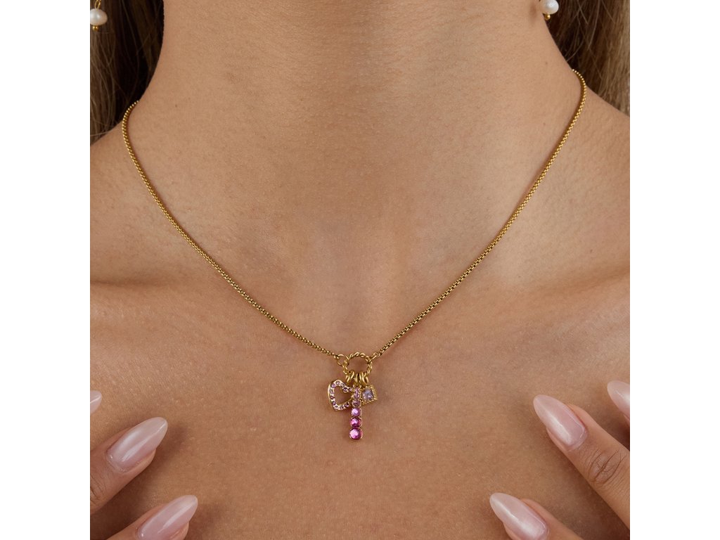 Náhrdelník ELENYS Blush zdobí hravá kombinace přívěsků – srdíčko, tyčinka a drobný čtverec – osazené růžovými krystalky. Točený kroužek dodává celku jemný, ženský charakter.