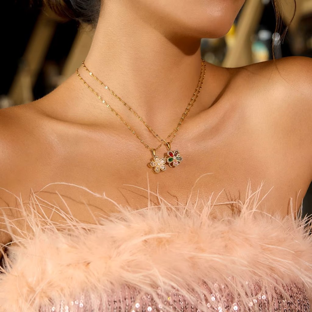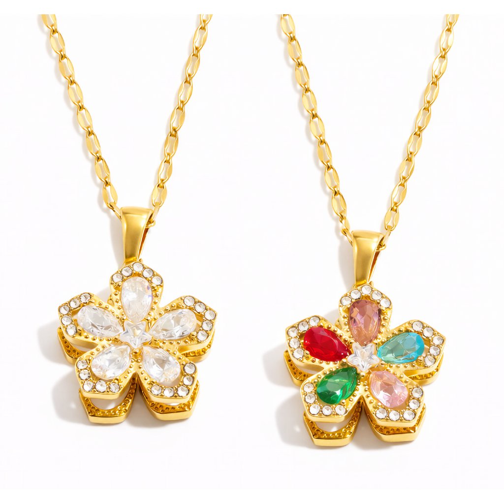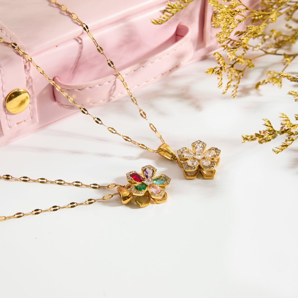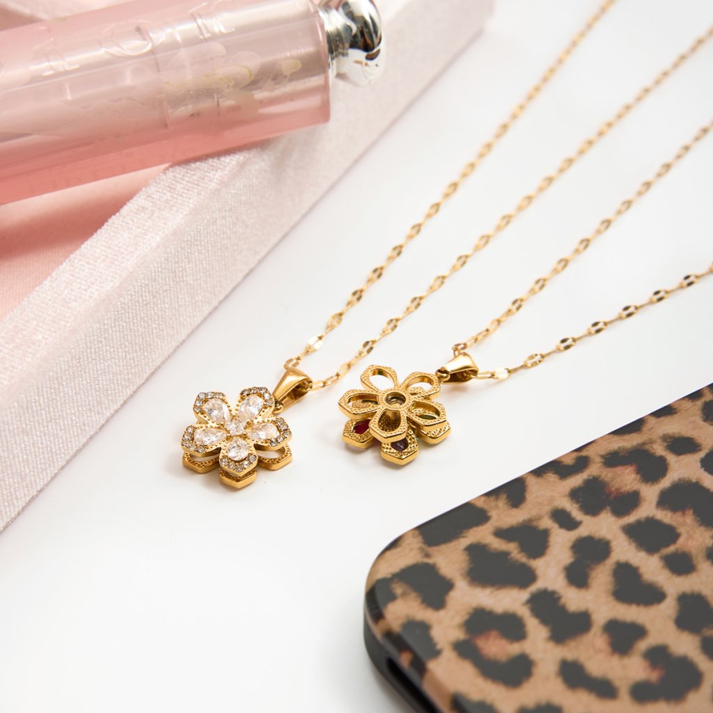 Květ je osazen čirými zirkony, které vytvářejí čistý, souvislý třpyt. Spinner efekt dodává šperku hravý detail – je to typ náhrdelníku, ke kterému se podvědomě vracíte dotekem.