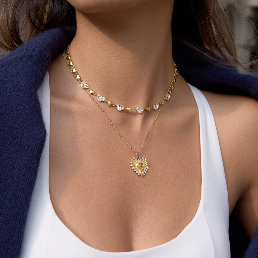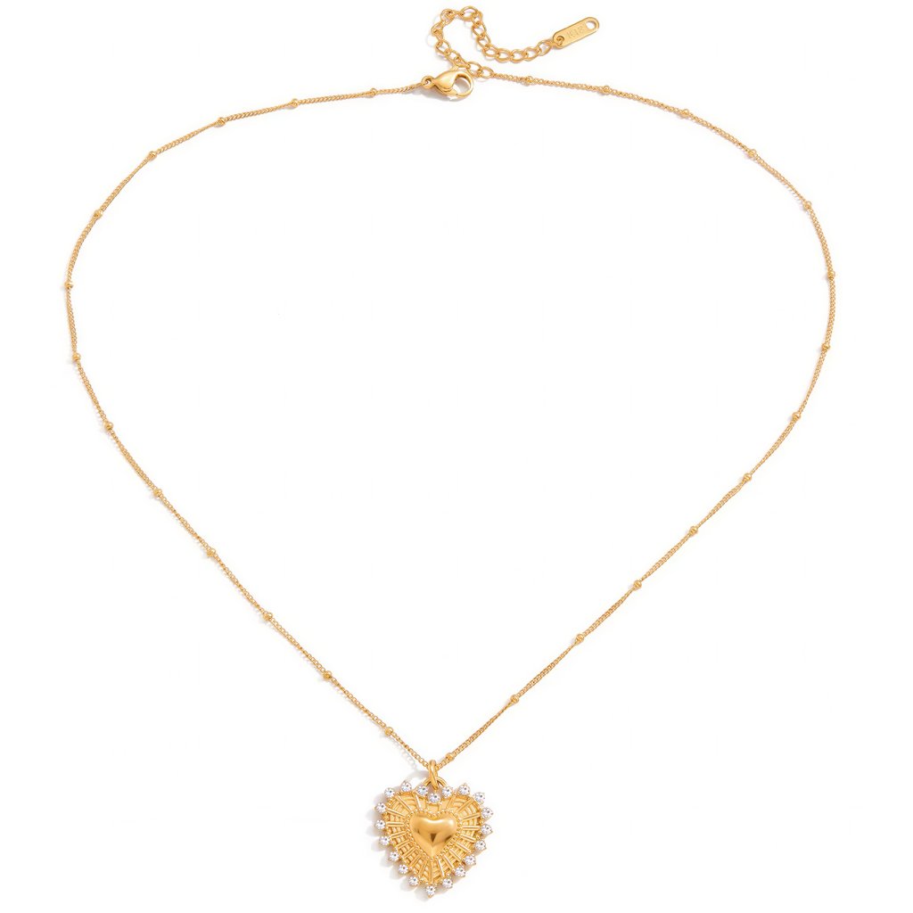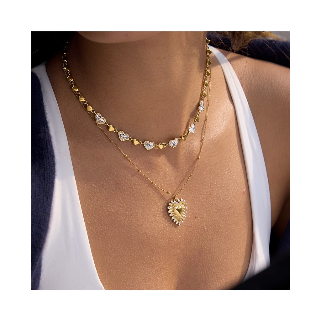 Okraj srdce je osazen čirými zirkony, které zachytávají světlo při každém pohybu. Kontrast hladkého středu a strukturovaných paprsků dodává šperku moderní, ale stále jemný charakter.