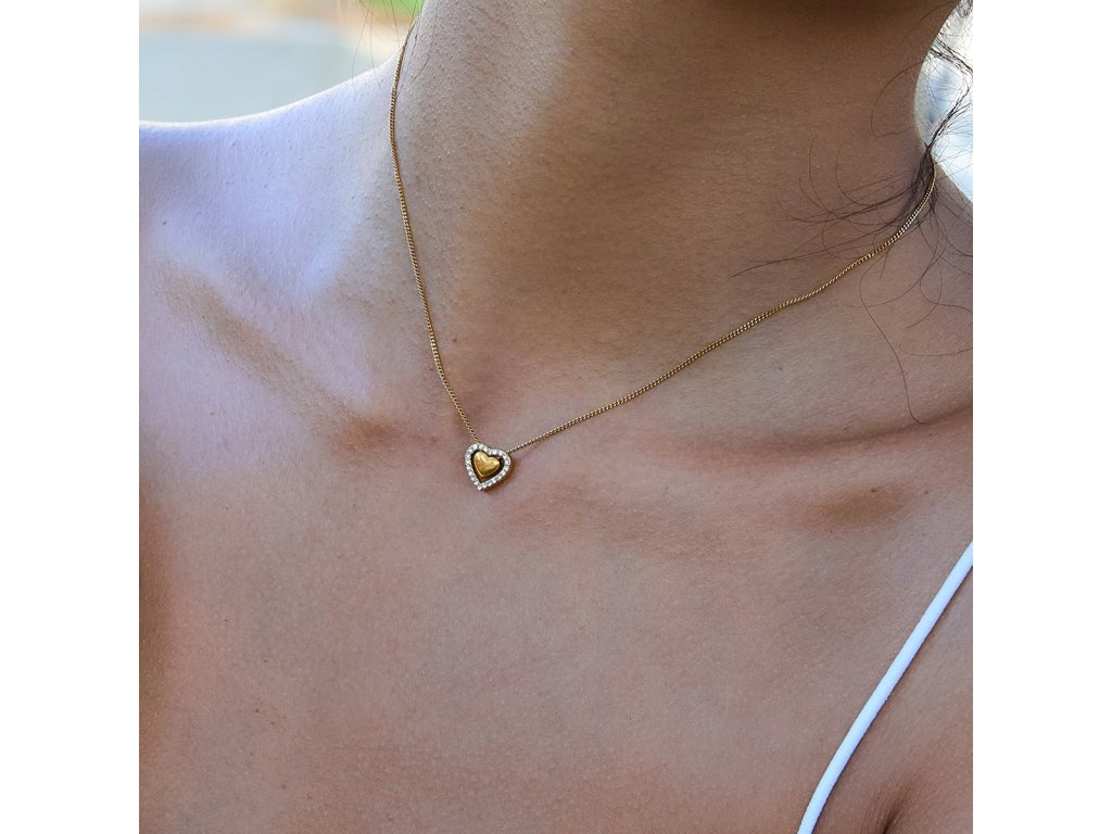 Náhrdelník ELENYS Heart Glow zdobí zářivé zlaté srdce zasazené do jemného lemu z čirých krystalků. Minimalistický motiv, který rozzáří dekolt a skvěle funguje k tričku i k šatům.