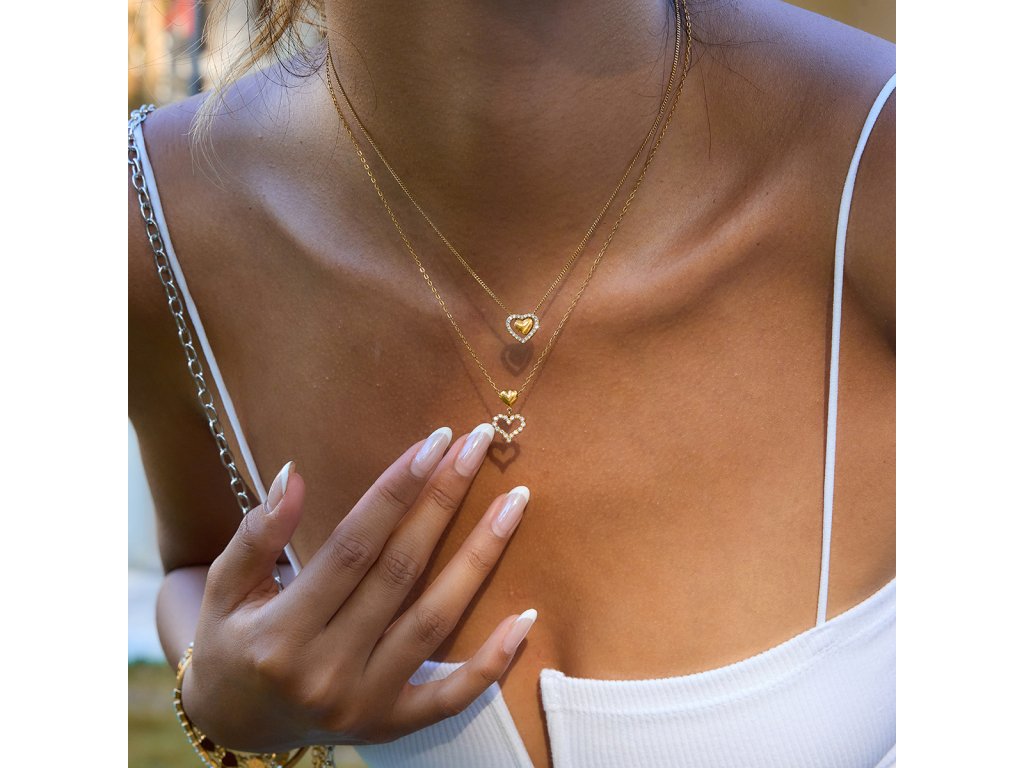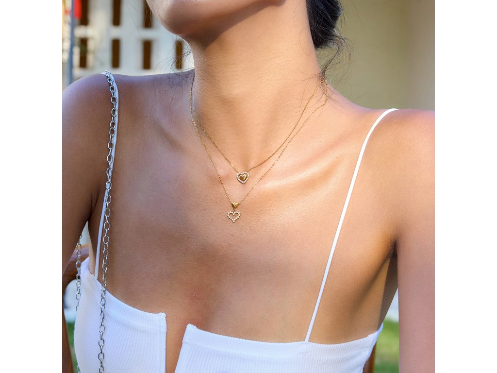 Náhrdelník ELENYS Heart Glow zdobí zářivé zlaté srdce zasazené do jemného lemu z čirých krystalků. Minimalistický motiv, který rozzáří dekolt a skvěle funguje k tričku i k šatům.