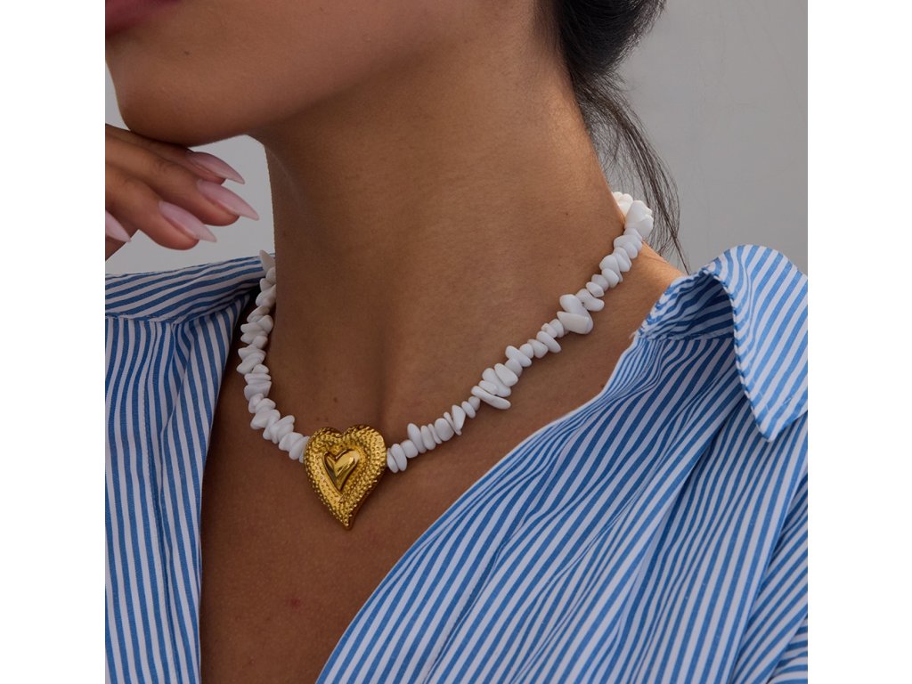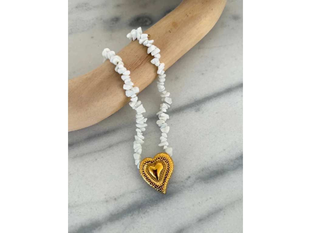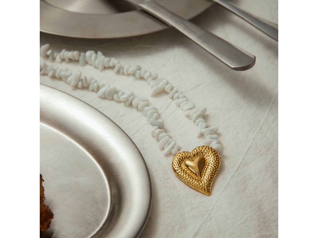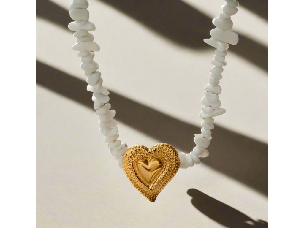 Bílý přírodní kámen a zlaté srdce – výrazný šperk s letní energií.
