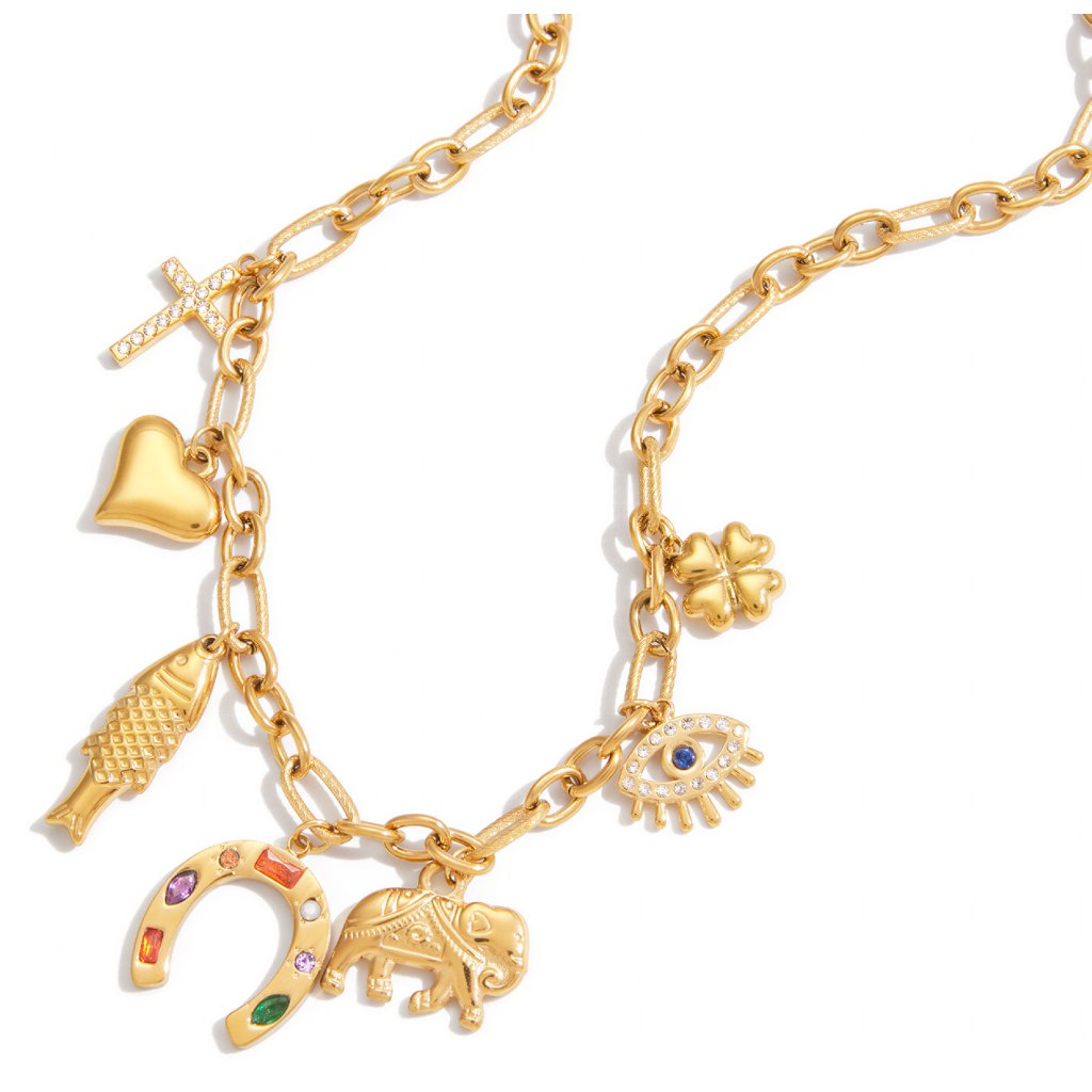 Lucky Symbols je výrazný řetízkový náhrdelník plný ochranných a šťastných symbolů – detail, který působí jako osobní talisman a přitahuje pohledy.