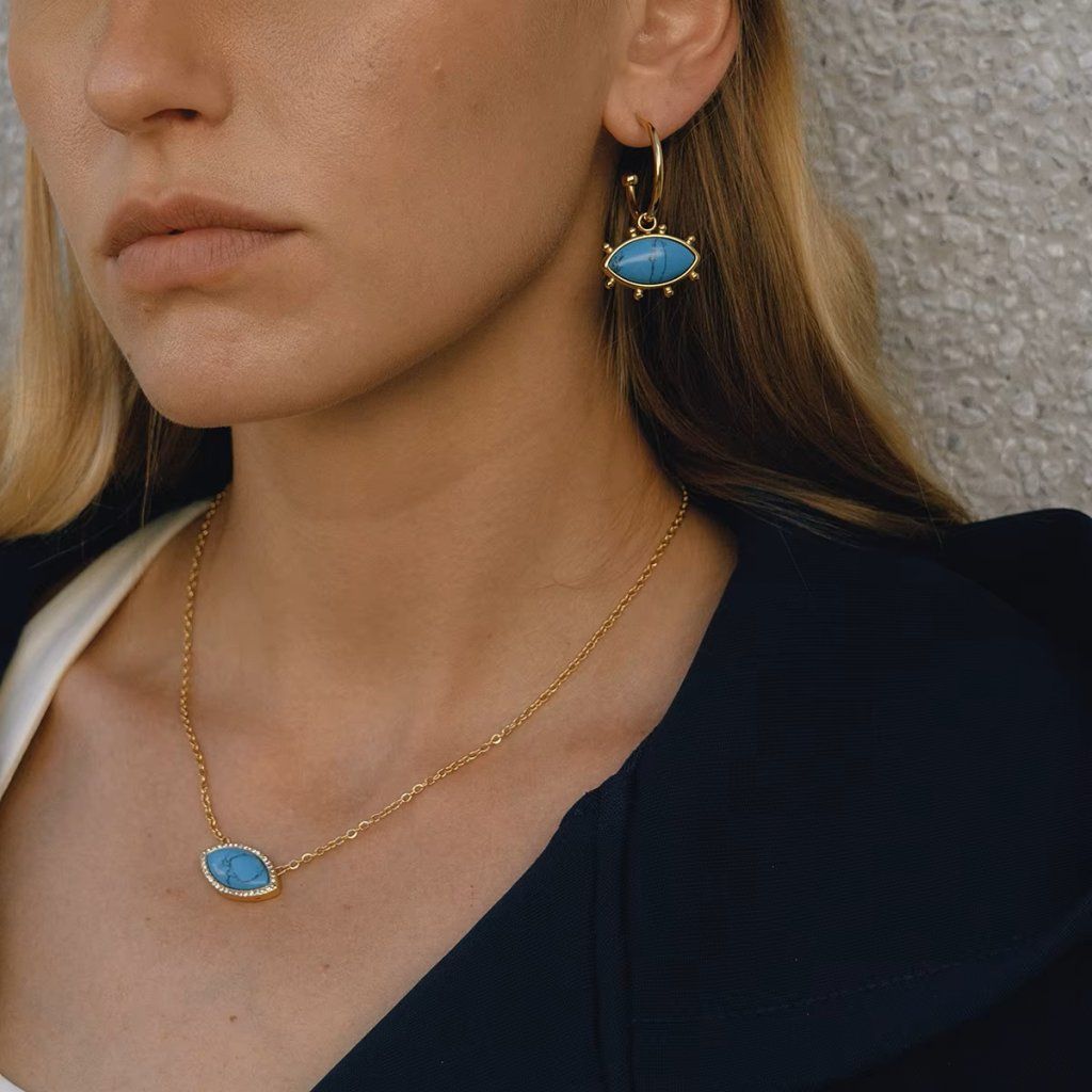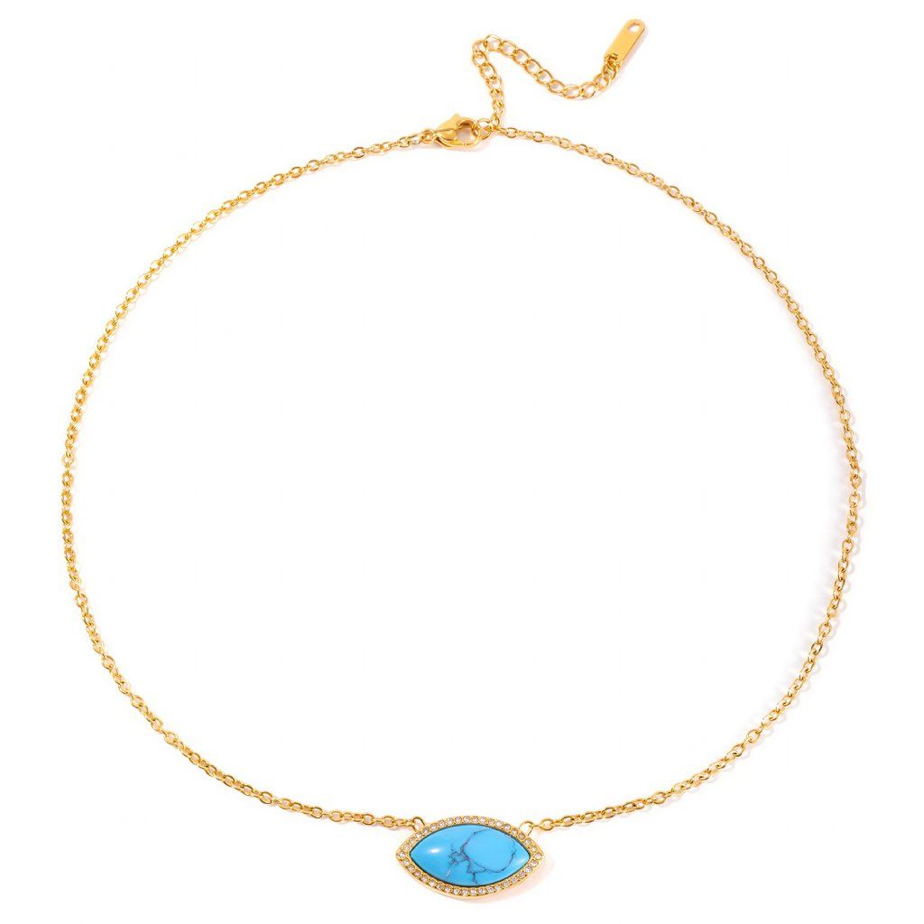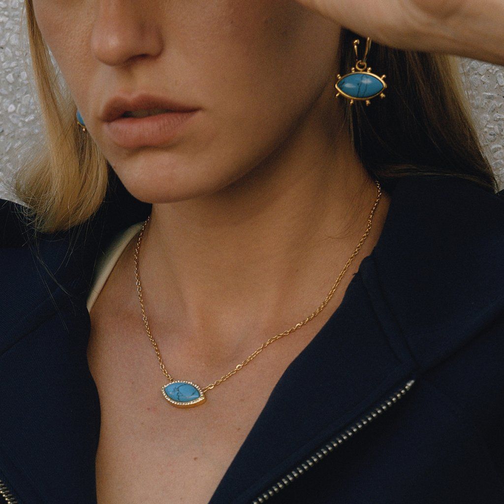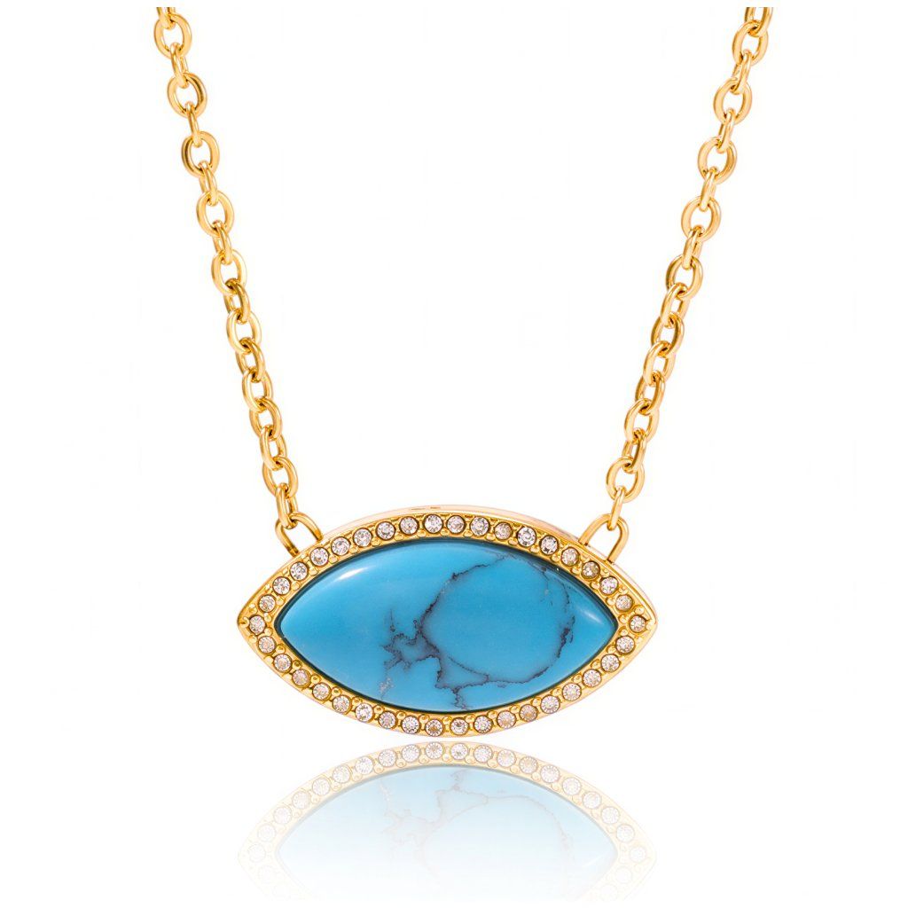 ELENYS Marella je jemný náhrdelník s tyrkysovým kamenem v elegantním tvaru oka, lemovaným drobnými čirými třpytivými zirkony, které dodávají šperku světlo a jemný luxusní lesk.