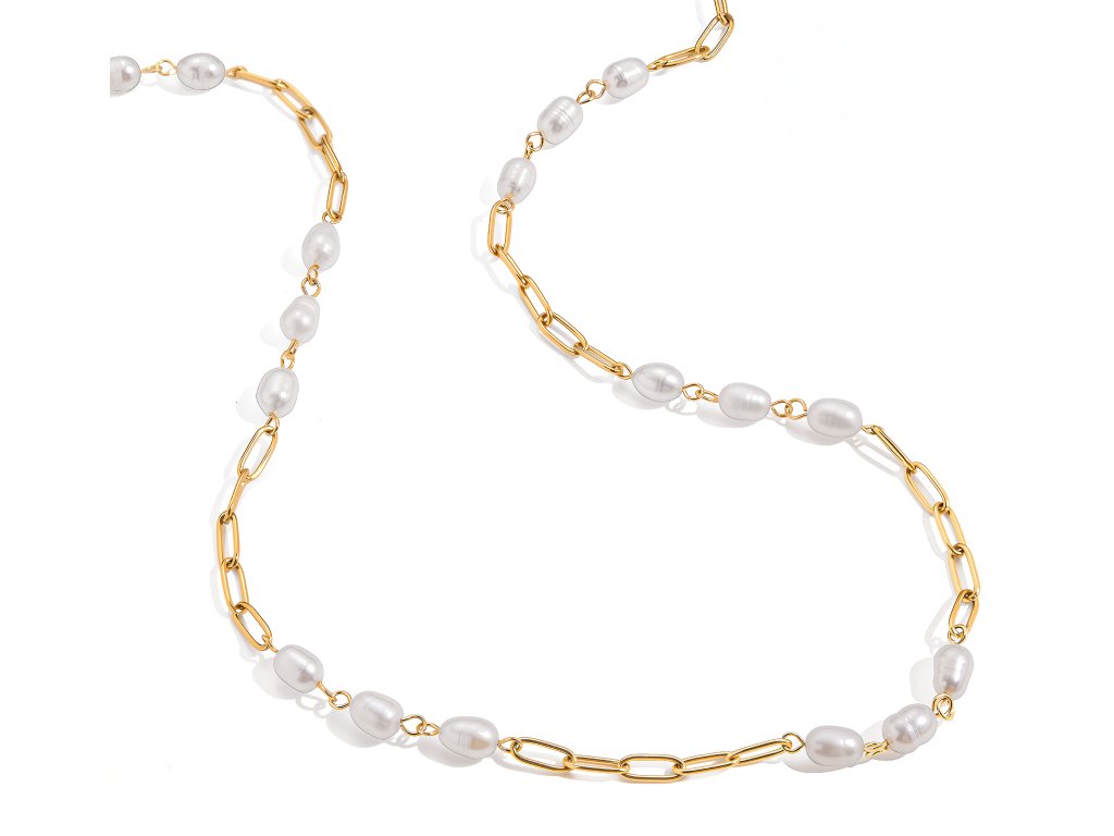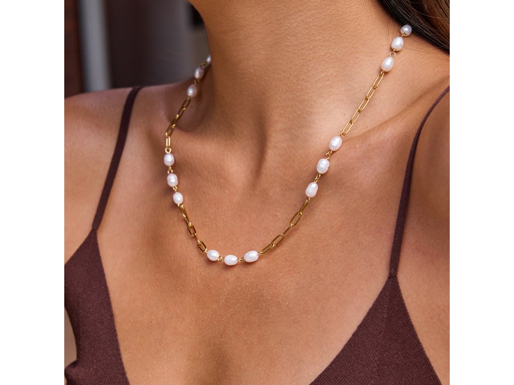ELENYS Nacre Link je jemný náhrdelník tvořený lehkou článkovou linií doplněnou perlami, které dodávají šperku klidný, přirozený výraz. Celek působí vyváženě, čistě a velmi žensky.
