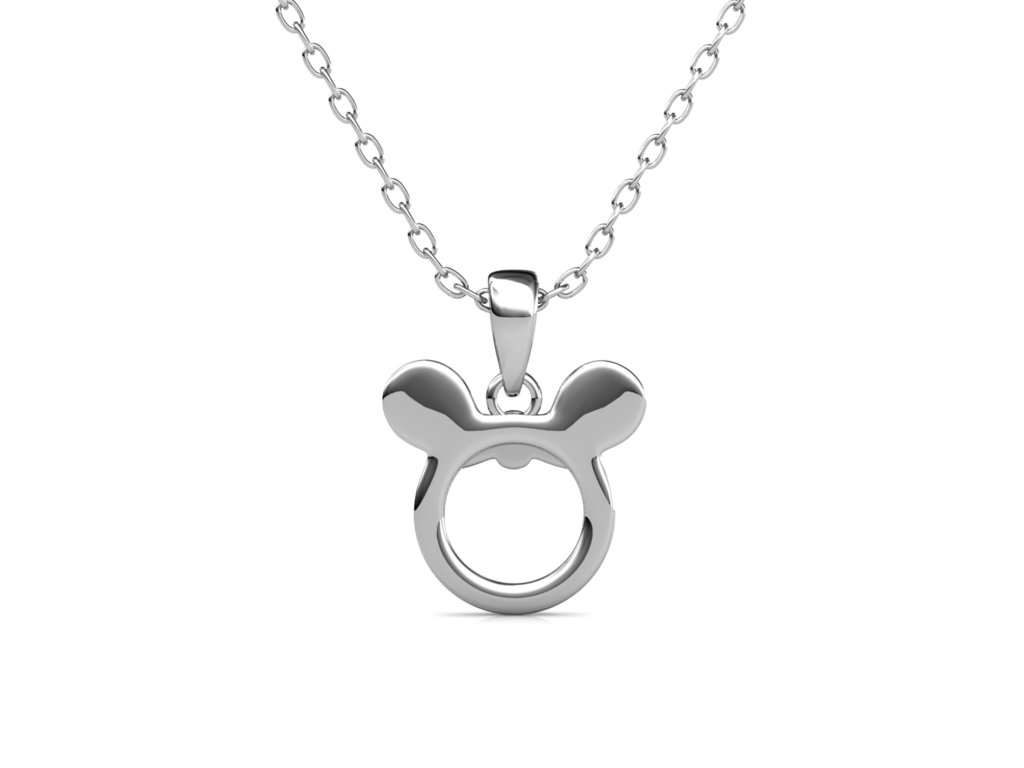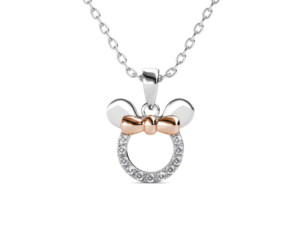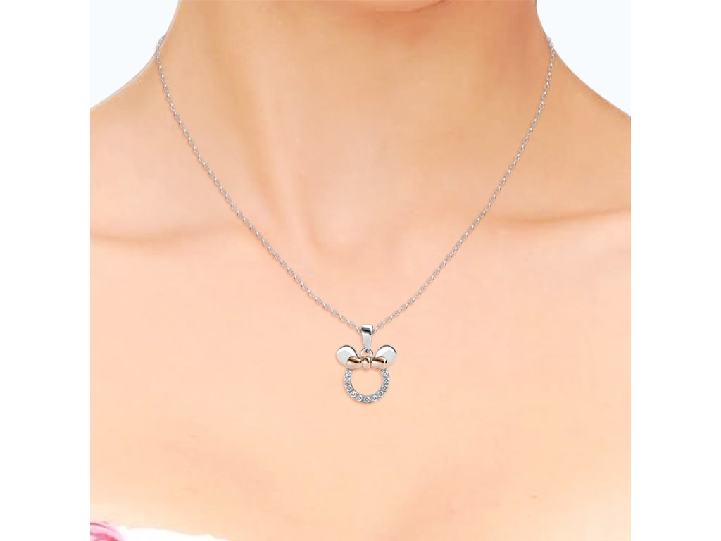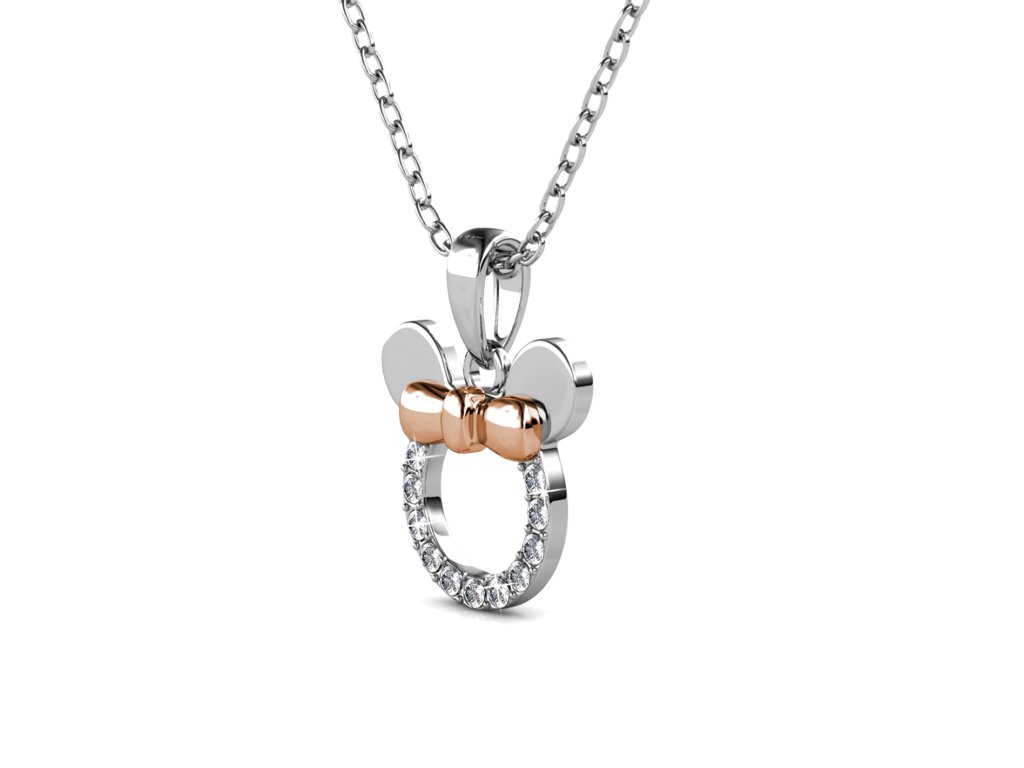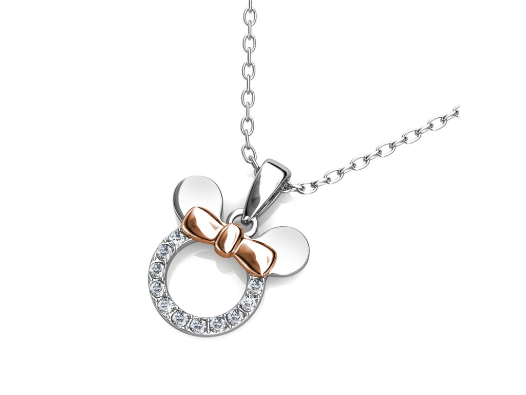 - Zlacený náhrdelník 18K bílým zlatem a 18k růžovým zlatem s přívěskem ve tvaru myšky Minnie, který je zdoben drahokamemy moissanity. Originální design náhrdelníku, kvalitní zpracování a materiál, ručně dohotovené.