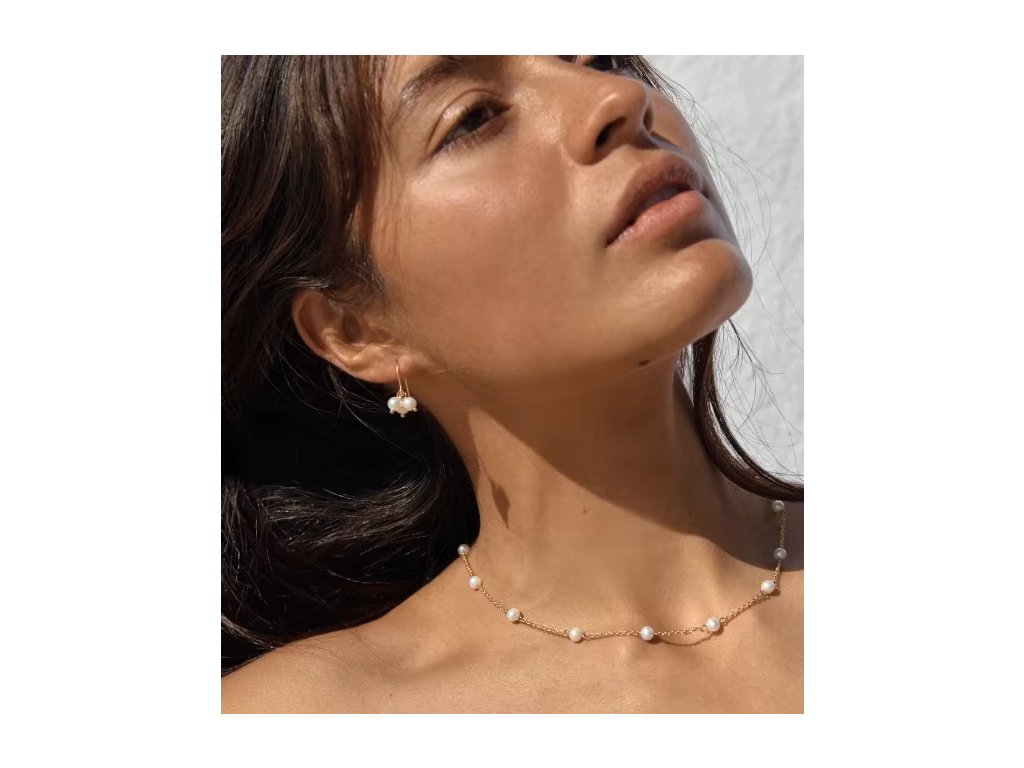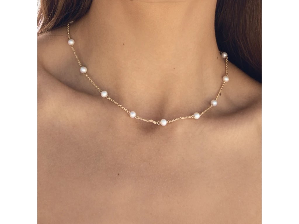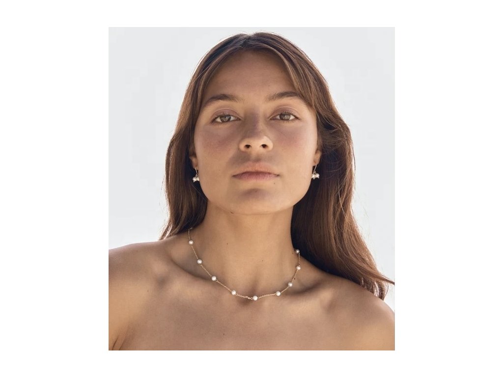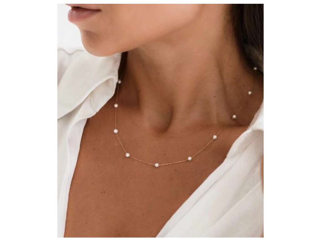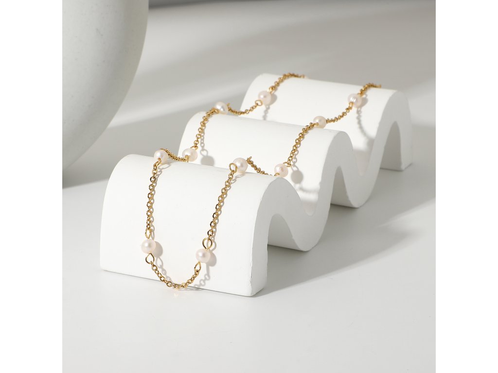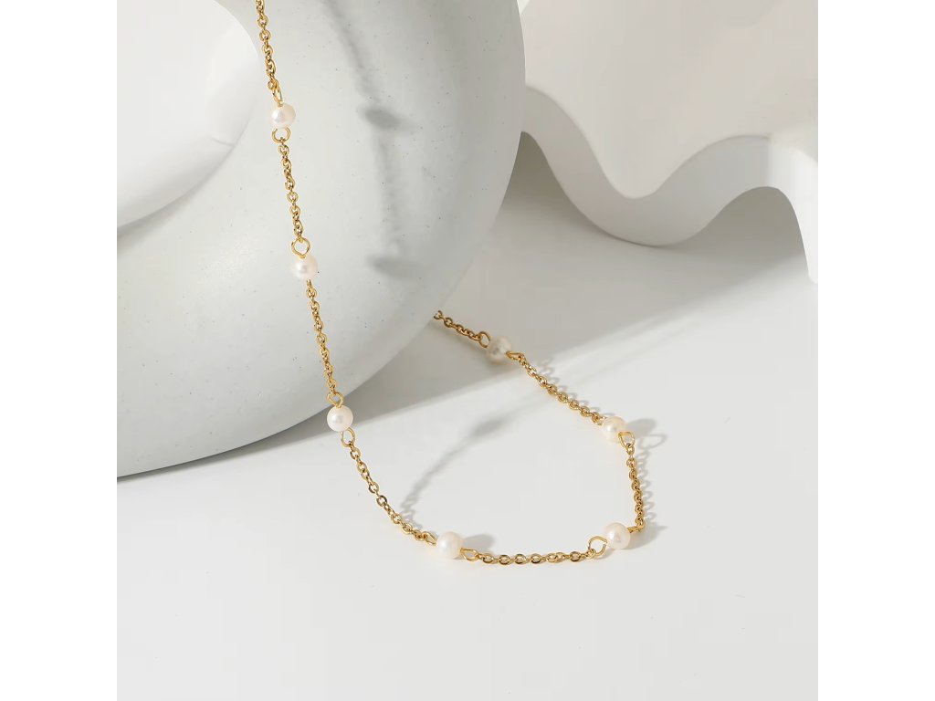 Řetízek zdobí pravidelně rozmístěné perly, které vytvářejí lehký, vzdušný efekt. Náhrdelník působí jemně a přirozeně luxusně – ideální ke každodenním outfitům i elegantním příležitostem.