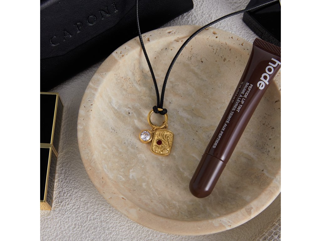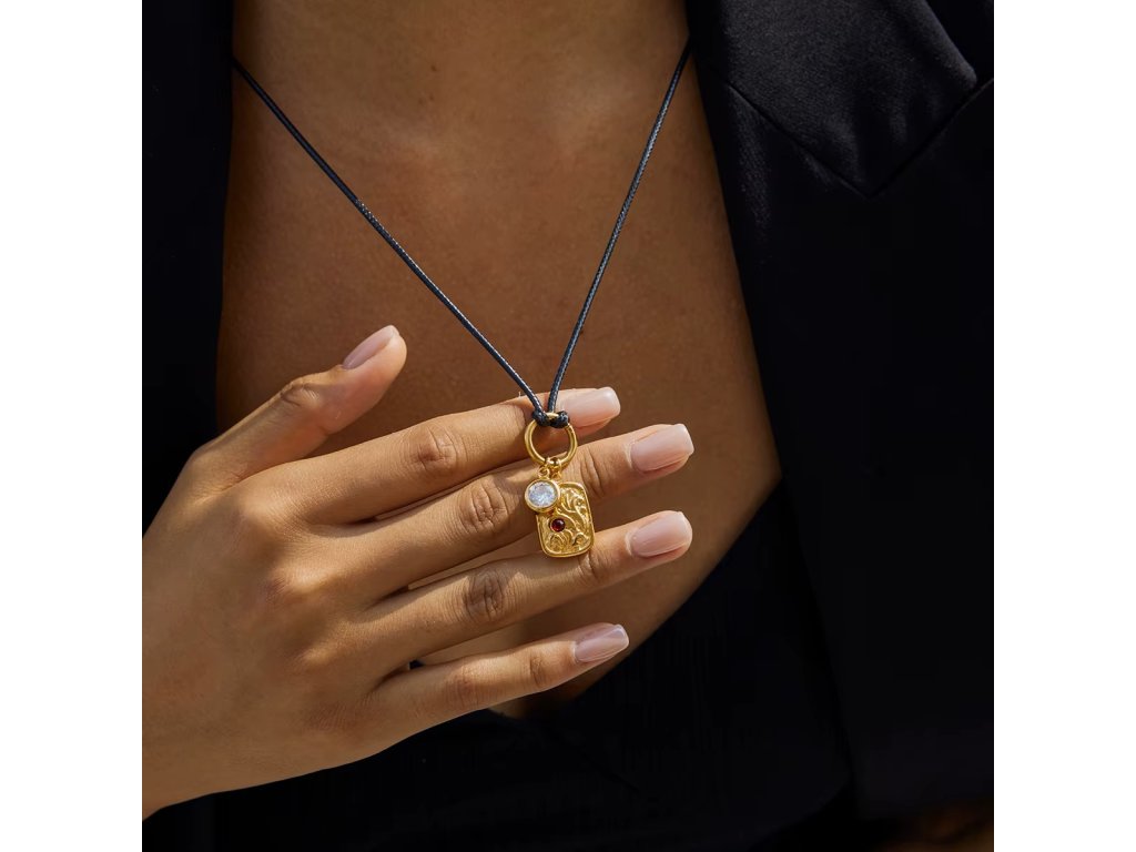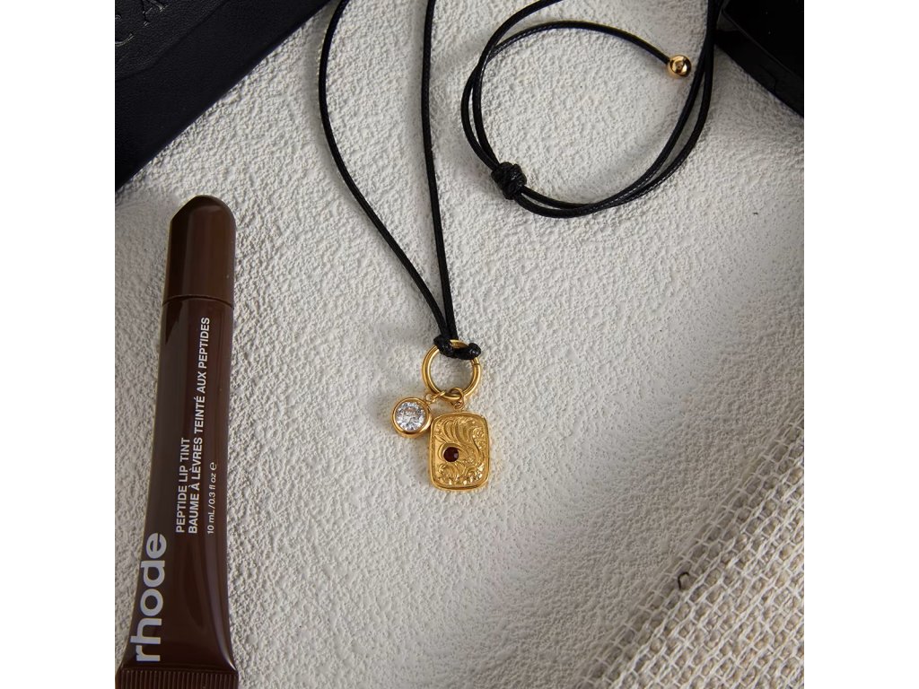ELENYS Relic Cord je náhrdelník, který působí jako drobný artefakt. Reliéfní obdélníkový přívěsek s ornamentální strukturou doplňuje červený a čirý zirkon, které dodávají šperku hloubku a světelný akcent. Celek působí výrazně, sebevědomě a s jasným charakterem.