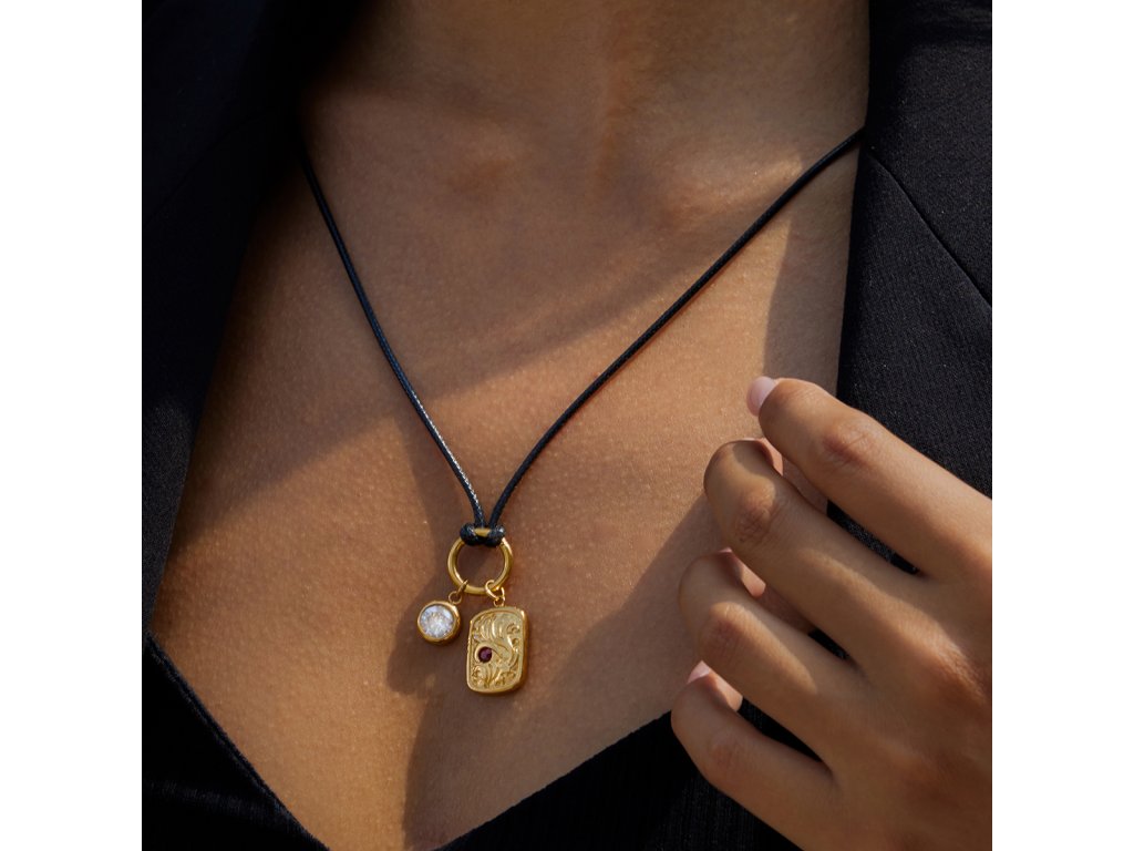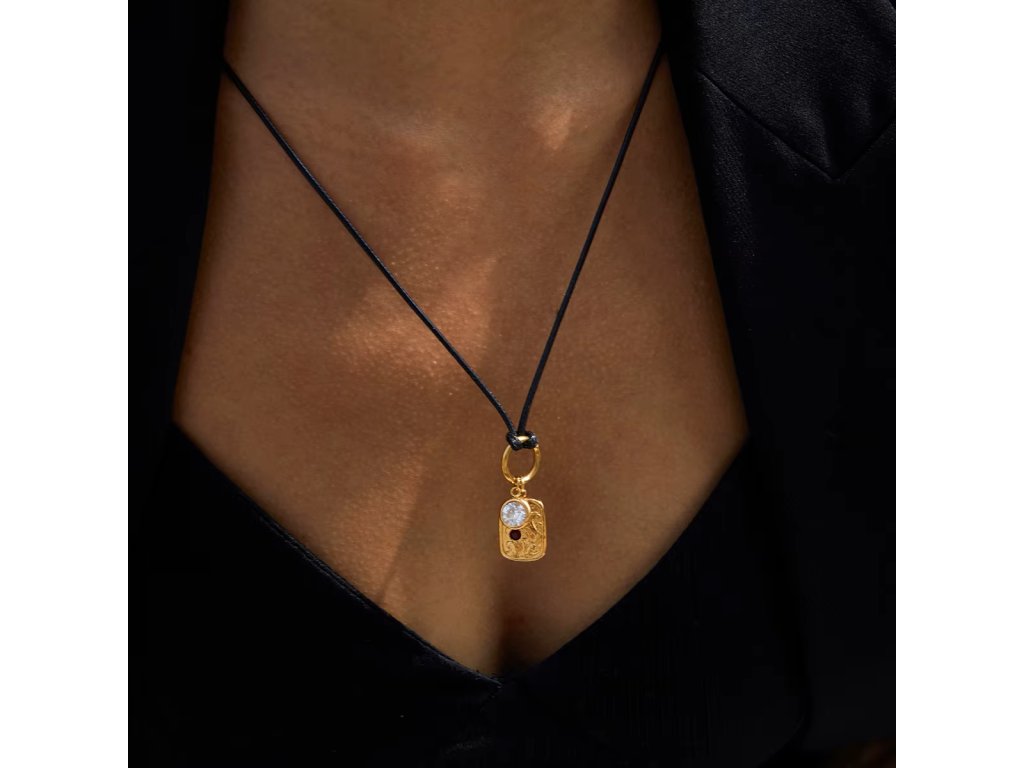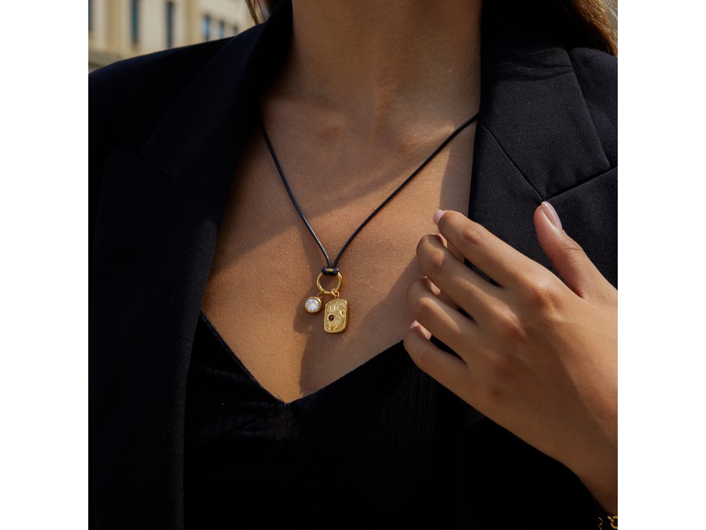 Textilní šňůrka vytváří kontrast k pozlacenému přívěsku a podtrhuje osobitý a lehce bohémský charakter šperku. Díky nastavitelné délce se náhrdelník přirozeně přizpůsobí a lze jej nosit samostatně i kombinovat s dalšími šperky ELENYS.
