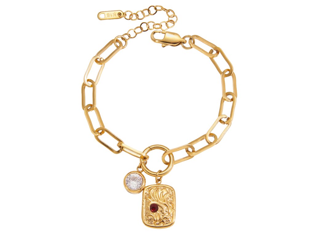 Ornamentální reliéf připomíná starobylý symbol nebo osobní talisman. Červený zirkon vytváří výrazný středový bod, zatímco čirý zirkon pod přívěskem přidává jemný třpyt a pohyb. Šperk nepůsobí okázale, ale rozhodně nezůstává nenápadný.