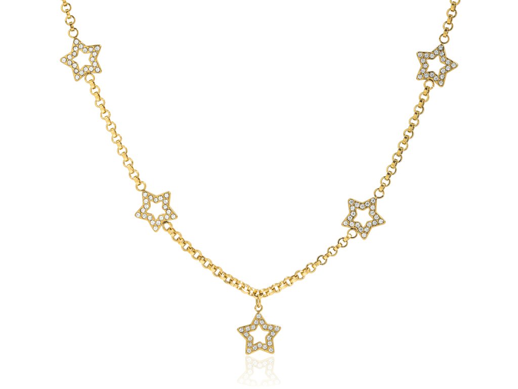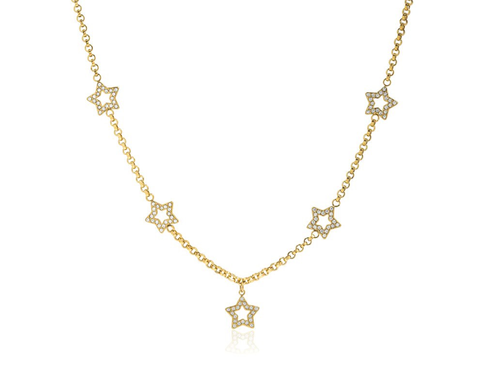 Každá z pěti hvězd je vykládaná čirými krystalky, které zachycují světlo z každého úhlu. Spolu s jemným zlatým řetízkem vytvářejí moderní, hravý a ženský doplněk, ideální jak k letním outfitům, tak k večerním šatům.