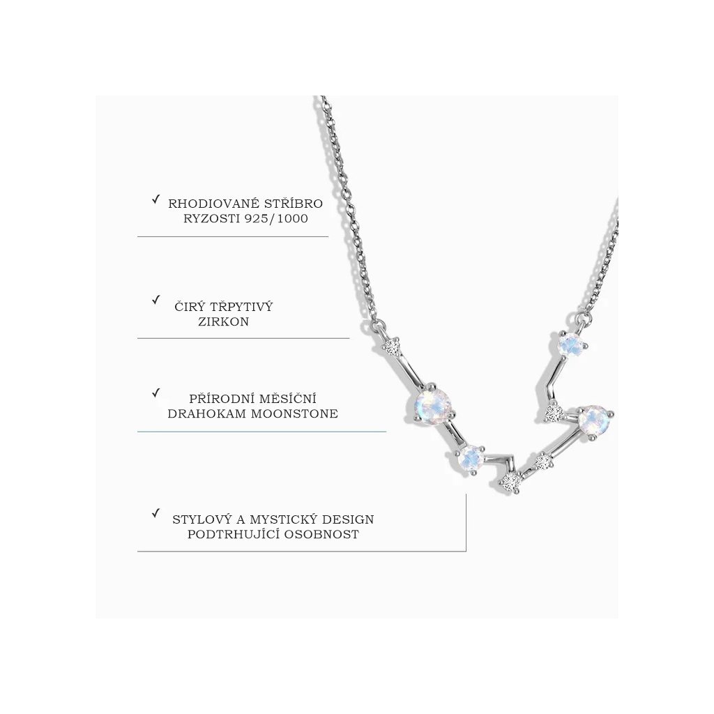 - Objevte kouzlo hvězd s naším elegantním náhrdelníkem ve znamení Býk, inspirovaným souhvězdím tohoto mystického znamení. Náhrdelník je jemně zdobený čirými zirkony, které reprezentují hvězdy, a doplněný přírodním měsíčním drahokamem Moonstonem, symbolizujícím intuici a klidnou energii. Tento šperk je nejen krásným doplňkem, ale i osobním amuletem, který zdůrazní vaši jedinečnost a propojení s vesmírem. Ideální jako dárek pro někoho narozeného ve znamení Býk nebo pro každého, kdo miluje spojení elegance a hvězdné symboliky.