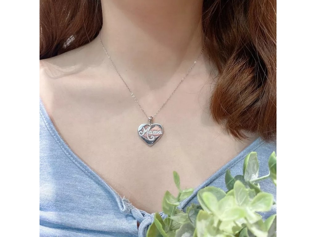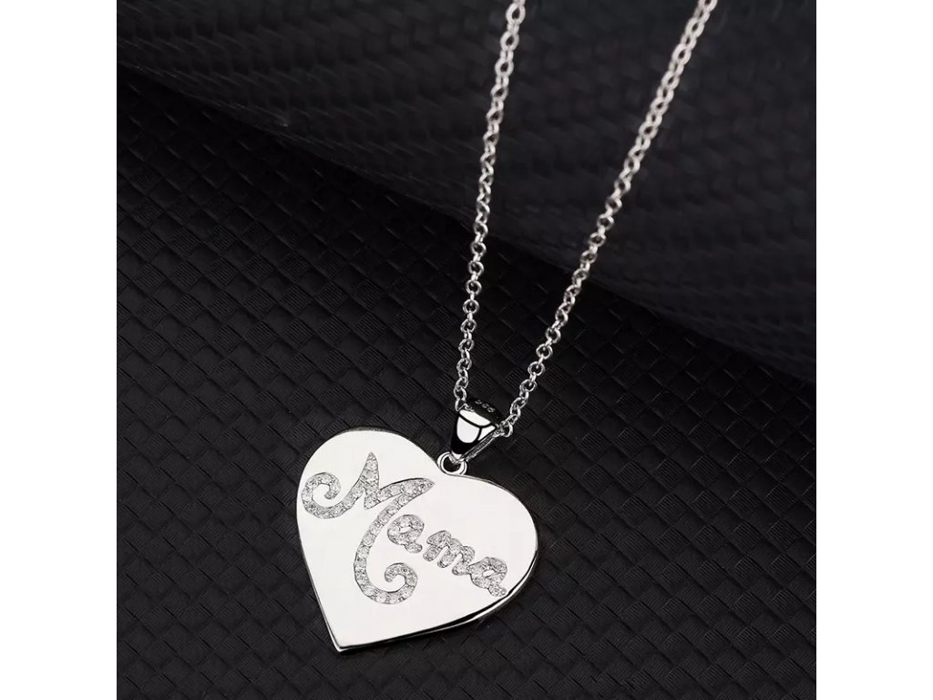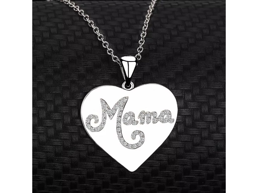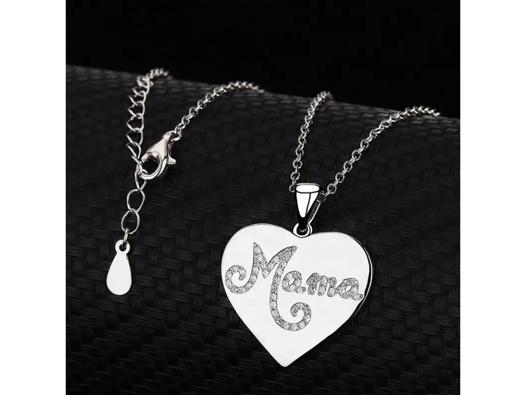 - Stříbrný rhodiovaný náhrdelník s přívěskem ve tvaru srdce s anglickým nápisem "Mama" v překladu "Maminka", který je zdoben čirými třpytivými zirkony. Originální design náhrdelníku, kvalitní zpracování a materiál, ručně dohotovené.