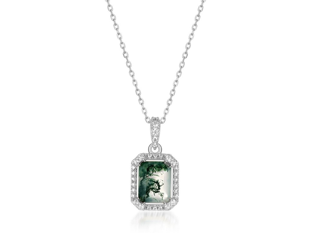 Royal Fashion Stříbrný rhodiovaný náhrdelník Mechový achát – Jemná elegance s přírodními prvky