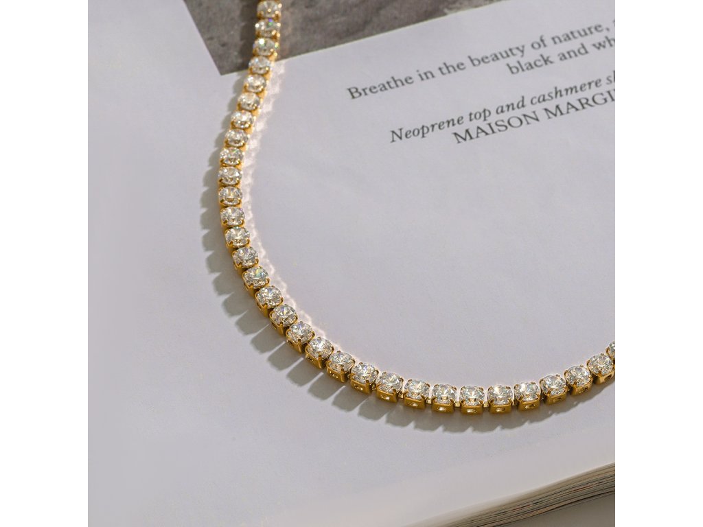 Zirkony jemně zachycují světlo a vytvářejí intenzivní, ale stále elegantní třpyt. Díky pravidelnému rytmu kamenů působí náhrdelník luxusně, přesto zůstává velmi nositelný i pro každodenní styling.