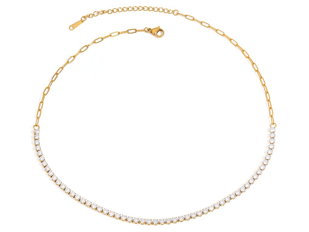 ELENYS Tennis Chain je jemný řetízkový choker tvořený souvislou řadou třpytivých zirkonů, které vytvářejí dokonale vyváženou světelnou linii. Design působí čistě, sofistikovaně a nadčasově – bez zbytečných ozdob.