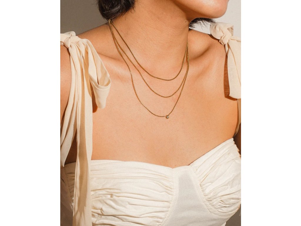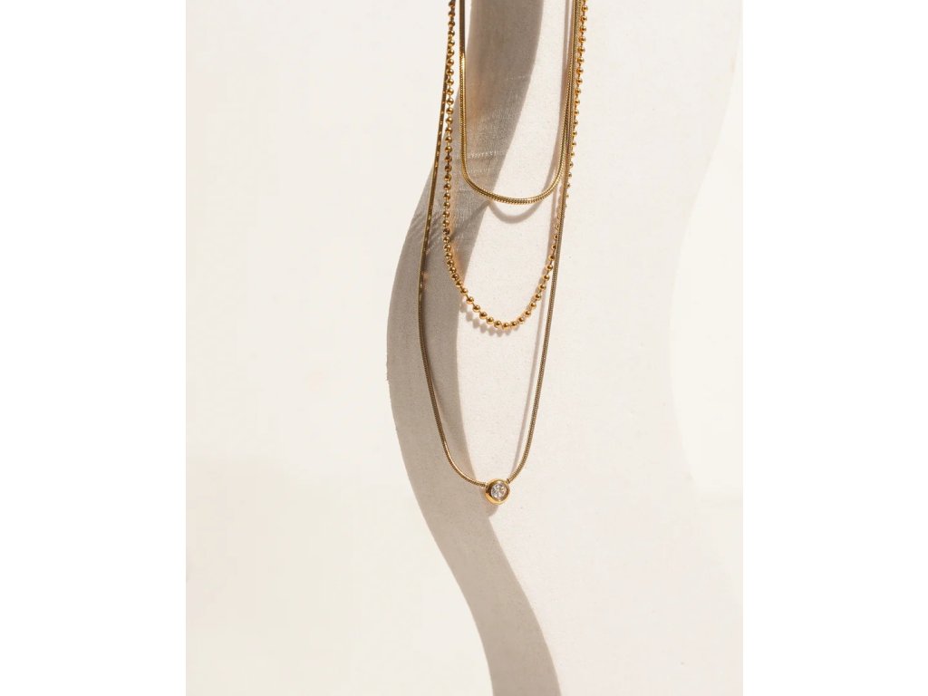 Náhrdelník ELENYS Trinity spojuje tři jemné řetízky – hladký, satelitní s drobnými korálky a minimalistický se zirkonem ve zlatém kotlíku. Výsledek je čistý a nadčasový, vhodný pro každodenní i večerní nošení.