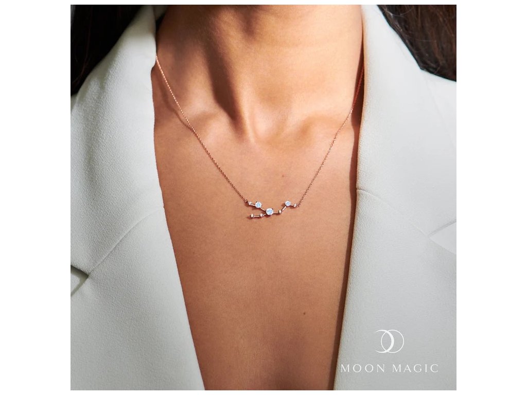 - Objevte kouzlo hvězd s naším elegantním náhrdelníkem ve znamení Býk, inspirovaným souhvězdím tohoto mystického znamení. Náhrdelník je jemně zdobený čirými zirkony, které reprezentují hvězdy, a doplněný přírodním měsíčním drahokamem Moonstonem, symbolizujícím intuici a klidnou energii. Tento šperk je nejen krásným doplňkem, ale i osobním amuletem, který zdůrazní vaši jedinečnost a propojení s vesmírem. Ideální jako dárek pro někoho narozeného ve znamení Býk nebo pro každého, kdo miluje spojení elegance a hvězdné symboliky.