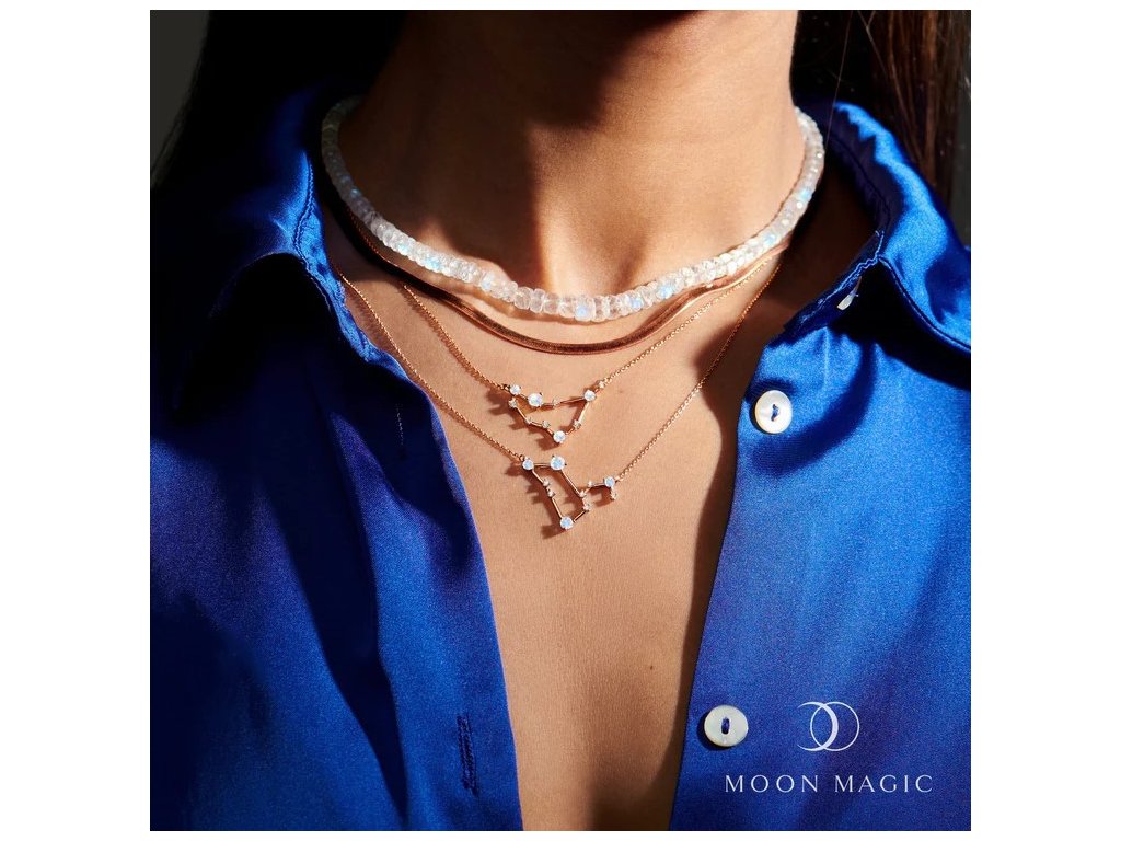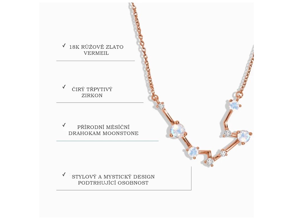 - Objevte kouzlo hvězd s naším elegantním náhrdelníkem ve znamení Kozoroh, inspirovaným souhvězdím tohoto mystického znamení. Náhrdelník je jemně zdobený čirými zirkony, které reprezentují hvězdy, a doplněný přírodním měsíčním drahokamem Moonstonem, symbolizujícím intuici a klidnou energii. Tento šperk je nejen krásným doplňkem, ale i osobním amuletem, který zdůrazní vaši jedinečnost a propojení s vesmírem. Ideální jako dárek pro někoho narozeného ve znamení Kozoroh nebo pro každého, kdo miluje spojení elegance a hvězdné symboliky.