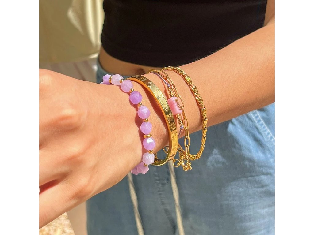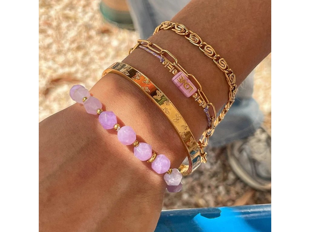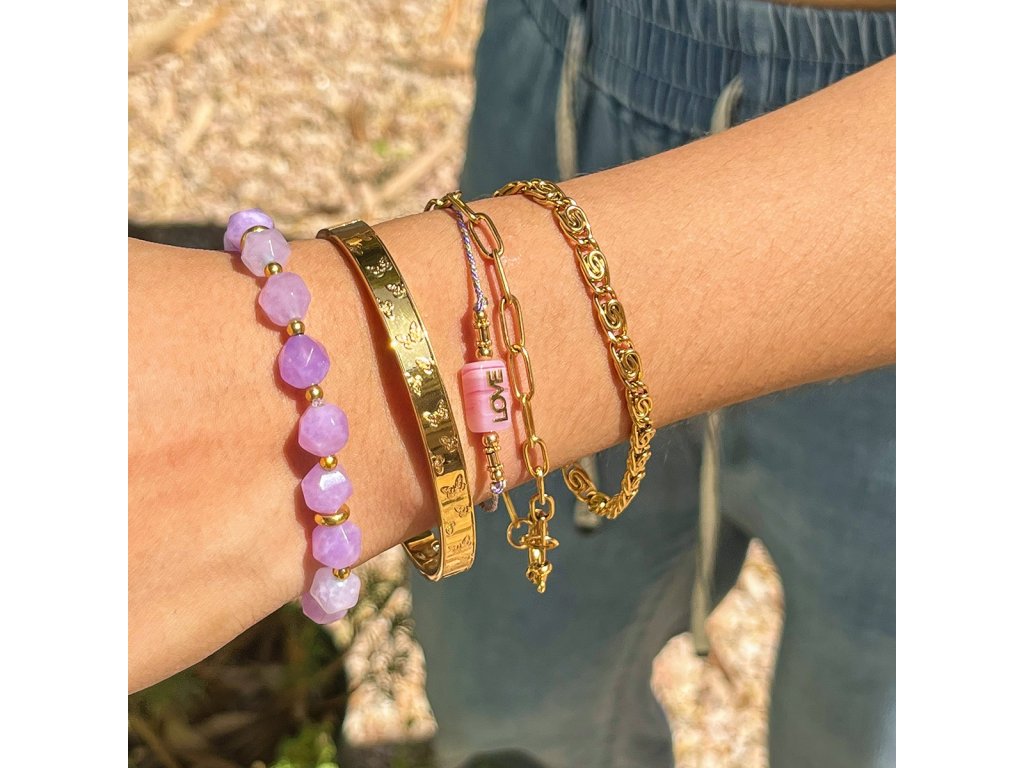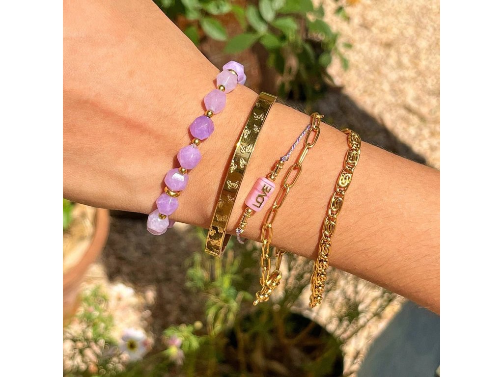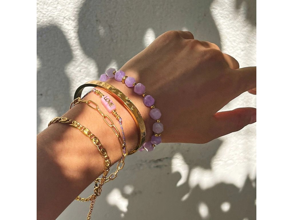 Na ruce působí lehce, klidně a velmi elegantně. Fialový ametyst vytváří harmonický kontrast se zlatými detaily a krásně se kombinuje s dalšími náramky ELENYS – i jako samostatný šperk ale vynikne svou jemnou silou.