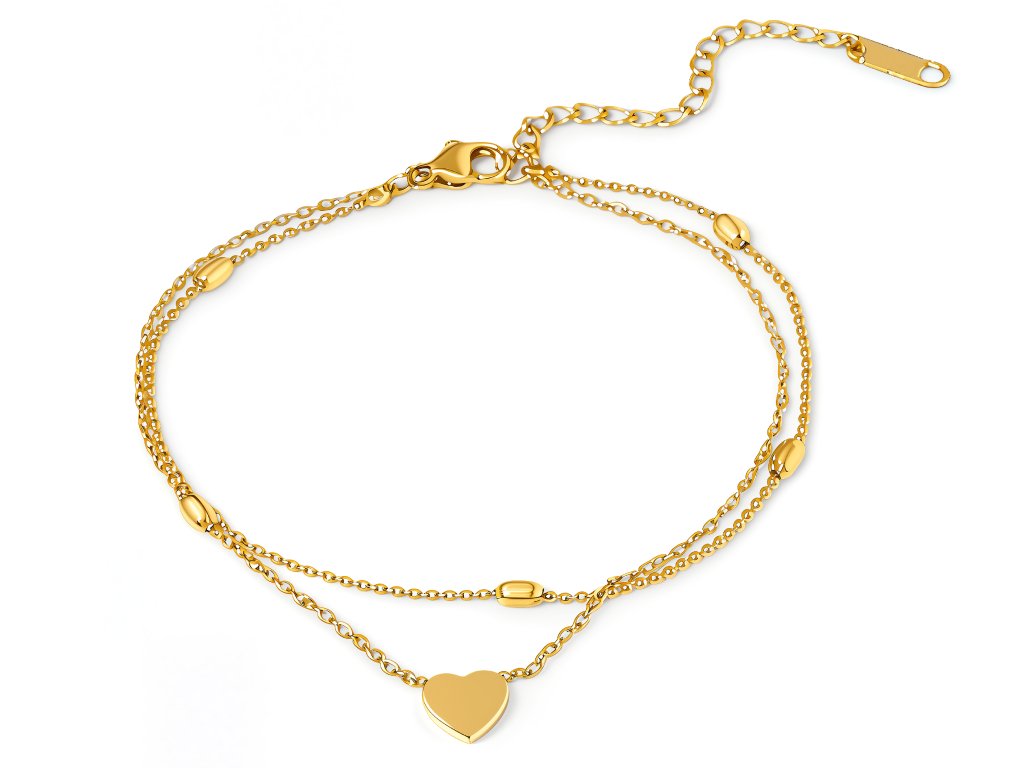 ELENYS Amora je jemný náramek na nohu navržený jako klidný symbol blízkosti a citu. Dvojitá linie působí vyváženě a lehce, zatímco drobné srdce přidává osobní význam bez okázalosti.