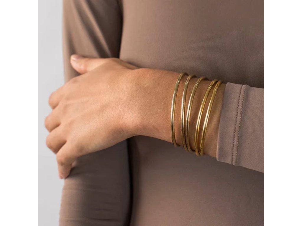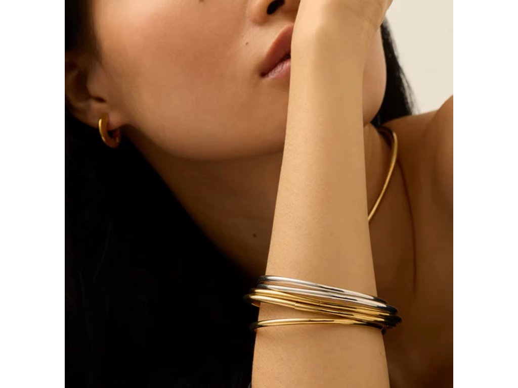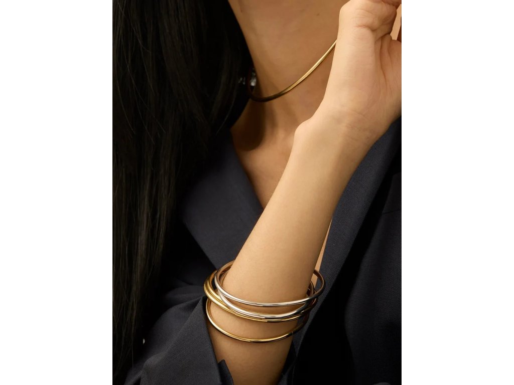 ELENYS BANGLE GOLD – kolekce tenkých zlatých náramků, které lze nosit samostatně nebo ve vrstvách. Minimalistický styl dodá jemnou eleganci každodenním i slavnostním outfitům.