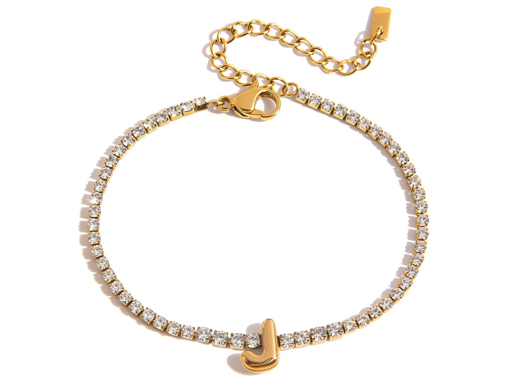 ELENYS Písmeno J je jemný náramek osazený čirými zirkony, které vytvářejí souvislou třpytivou linii. Dominantní písmeno dodává šperku osobní význam – může symbolizovat jméno, blízkého člověka nebo důležitý moment.