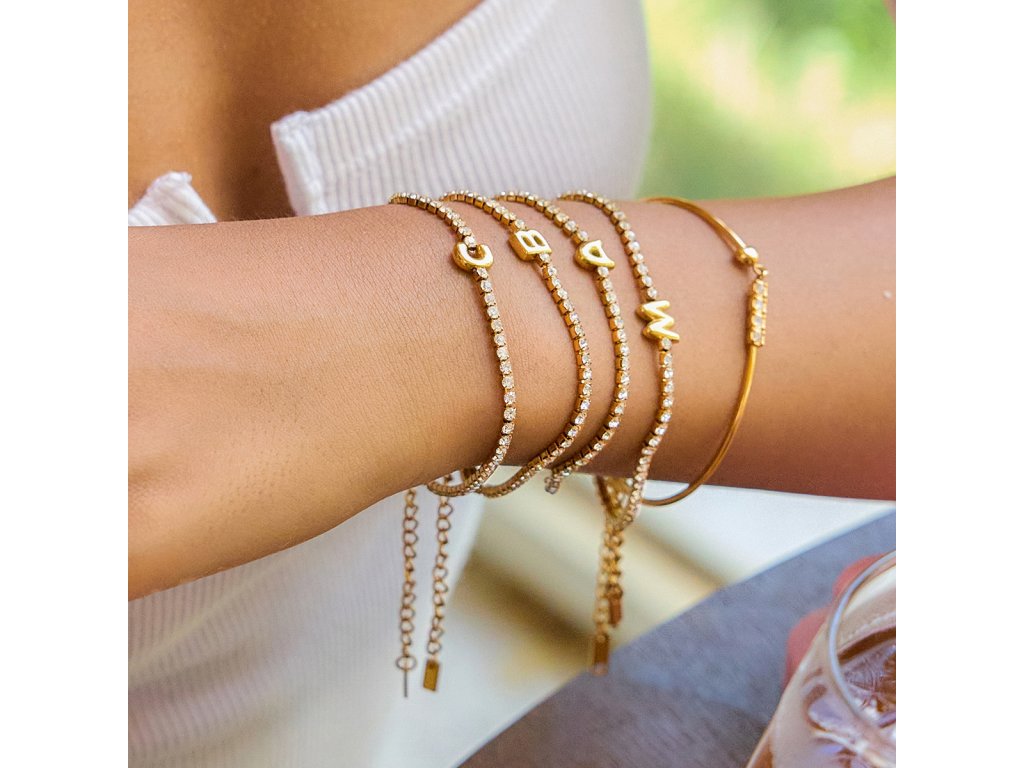 ELENYS Písmeno K je jemný náramek osazený čirými zirkony, které vytvářejí souvislou třpytivou linii. Dominantní písmeno dodává šperku osobní význam – může symbolizovat jméno, blízkého člověka nebo důležitý moment.