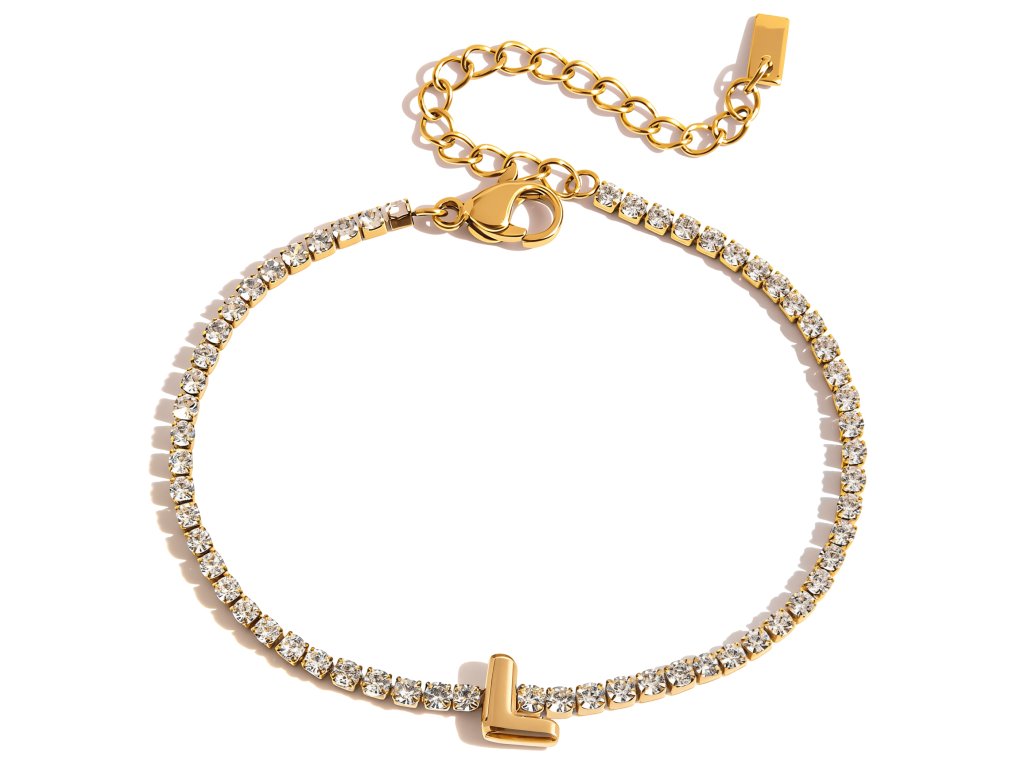 ELENYS Písmeno L je jemný náramek osazený čirými zirkony, které vytvářejí souvislou třpytivou linii. Dominantní písmeno dodává šperku osobní význam – může symbolizovat jméno, blízkého člověka nebo důležitý moment.