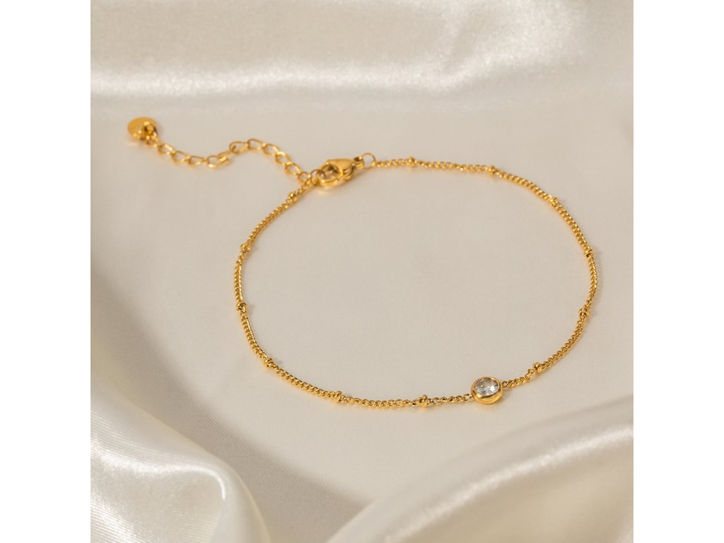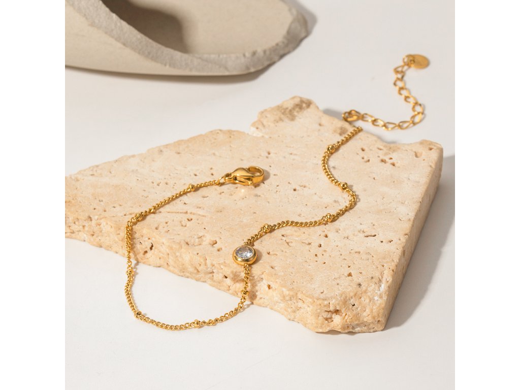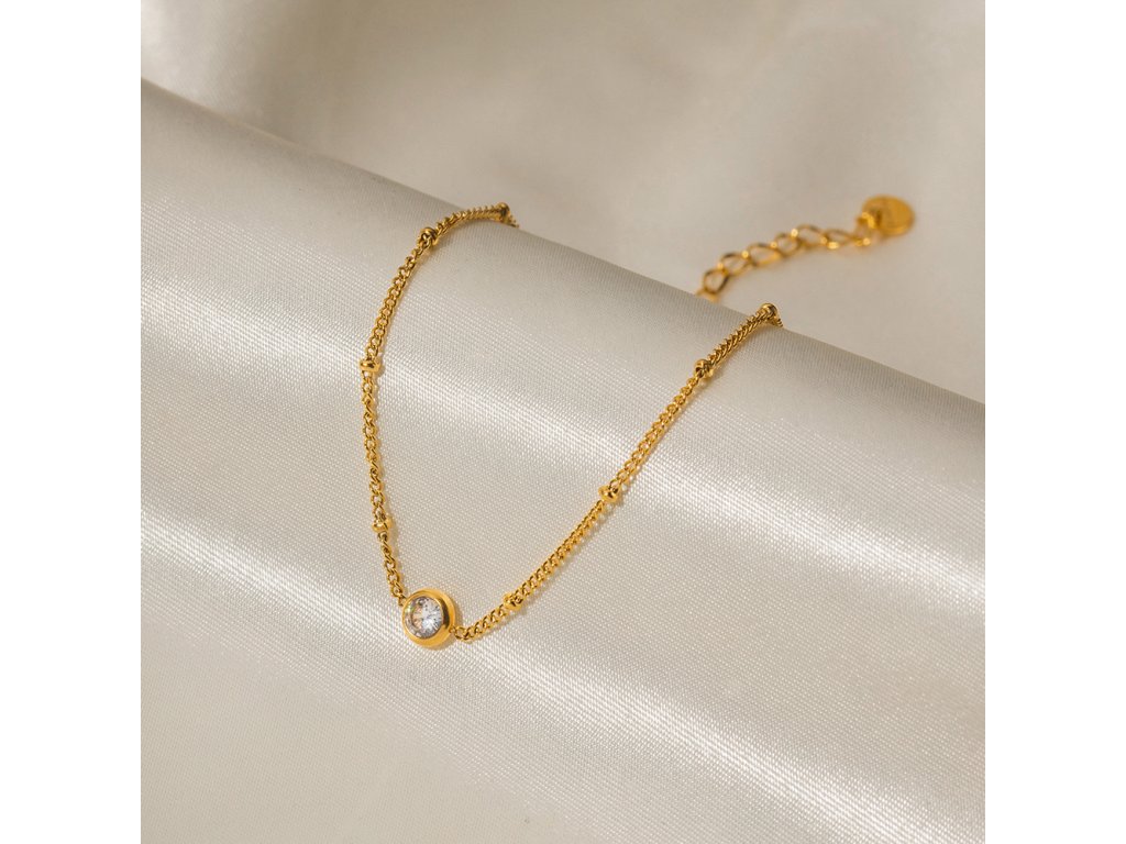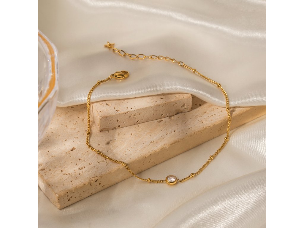 ELENYS Liora je minimalistický náramek na nohu, který staví na přesnosti detailu a klidné eleganci. Jemný řetízek doplňuje drobný zirkon zasazený do hladkého lůžka – čistý, vyvážený a přirozeně zářivý.