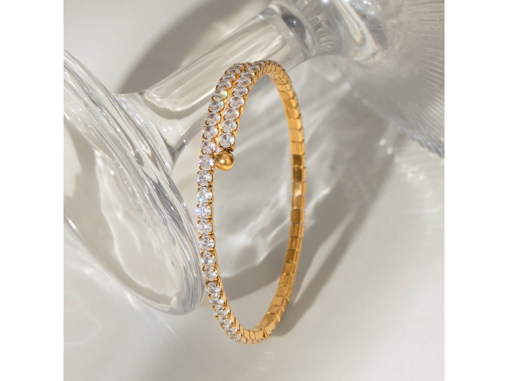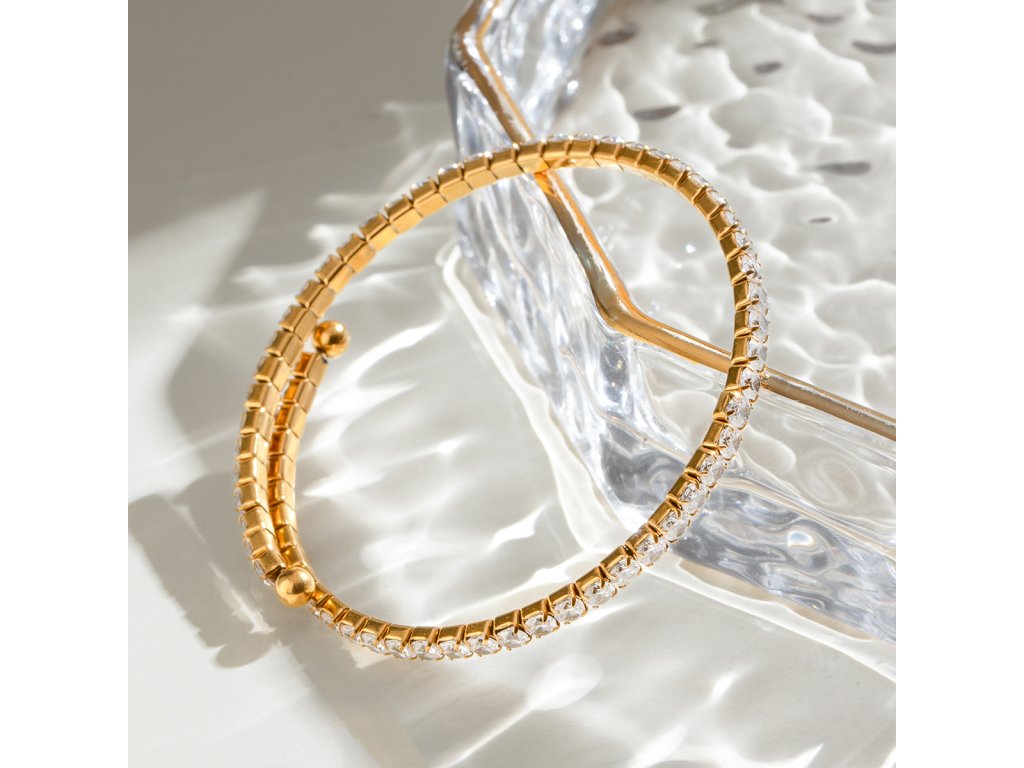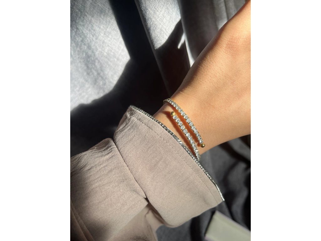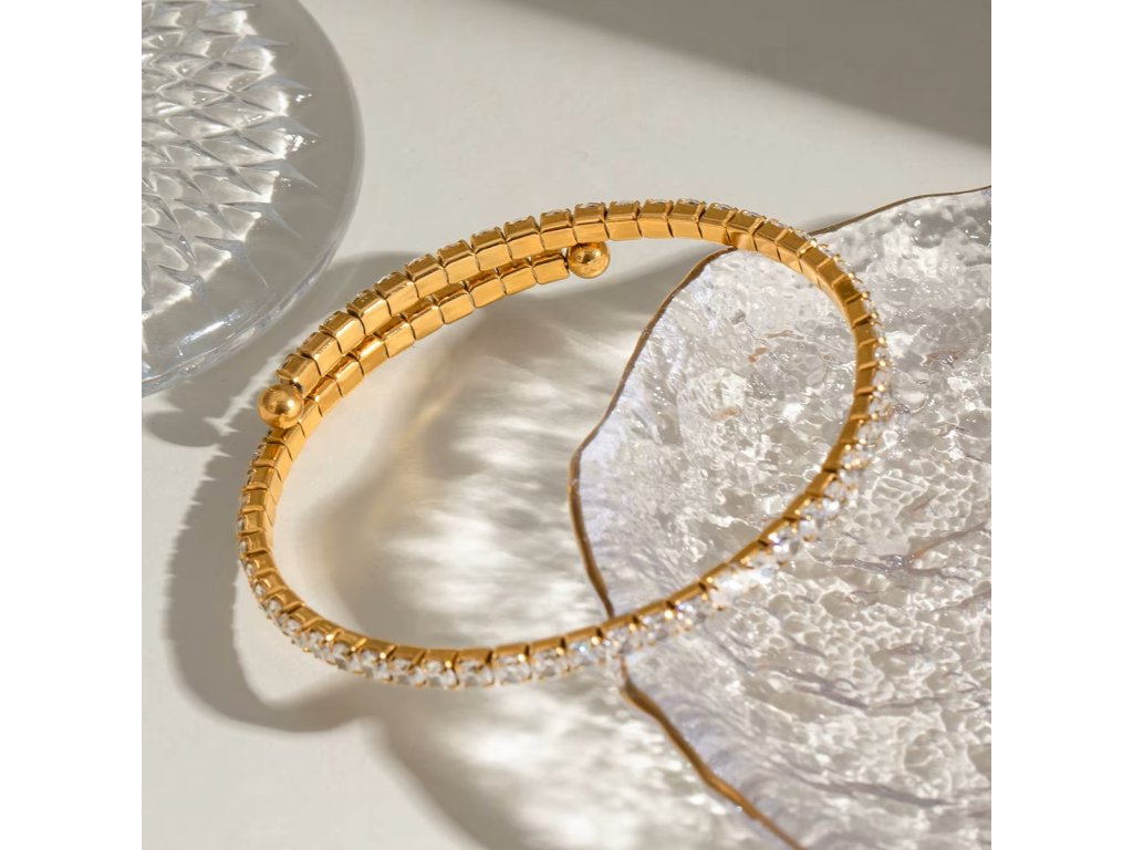 ELENYS BRACELET LUMINA – pružný zlatý náramek se zirkony, který kombinuje minimalistickou eleganci s luxusním třpytem. Díky univerzálnímu designu se hodí k samostatnému nošení i vrstvení s dalšími šperky.