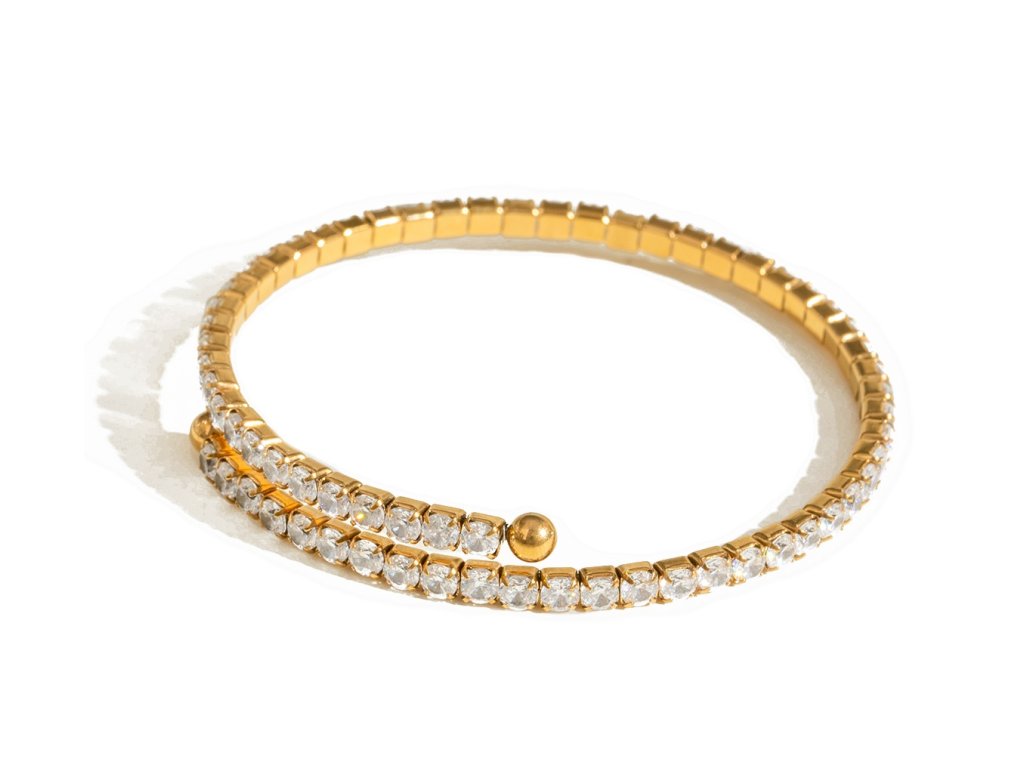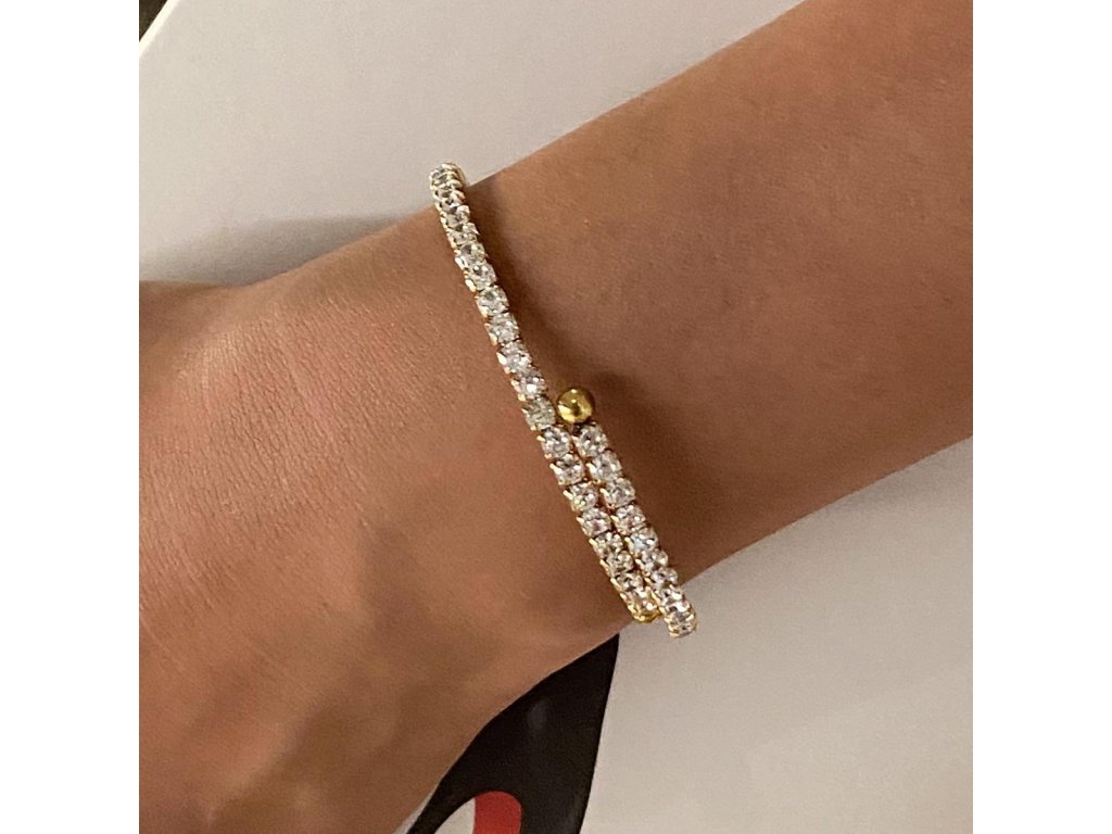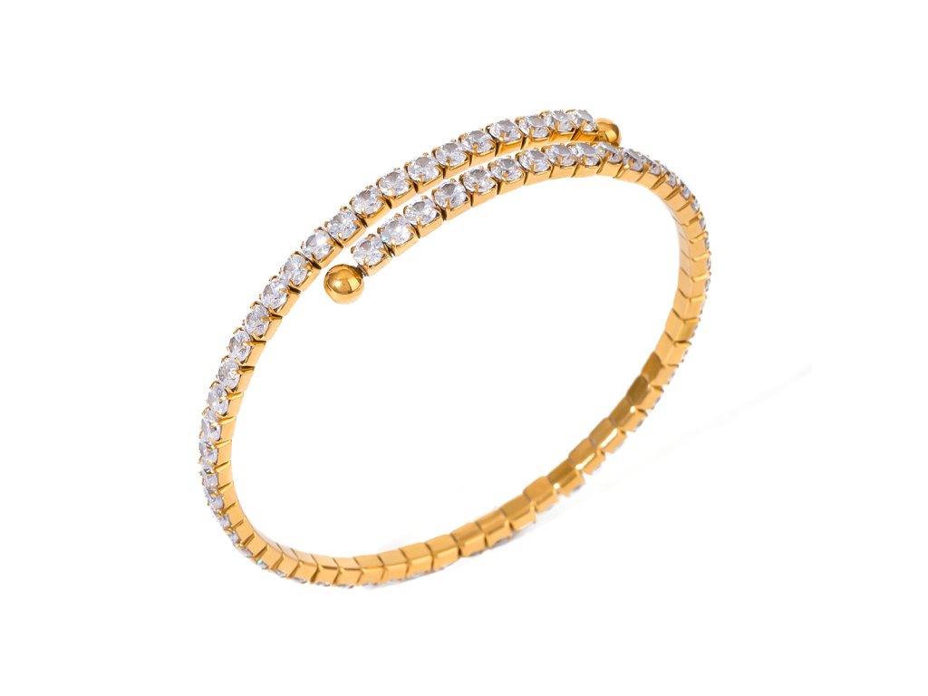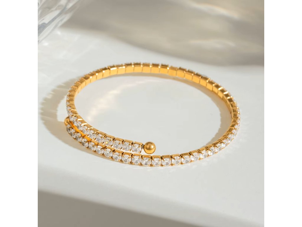 ELENYS BRACELET LUMINA – pružný zlatý náramek se zirkony, který kombinuje minimalistickou eleganci s luxusním třpytem. Díky univerzálnímu designu se hodí k samostatnému nošení i vrstvení s dalšími šperky.