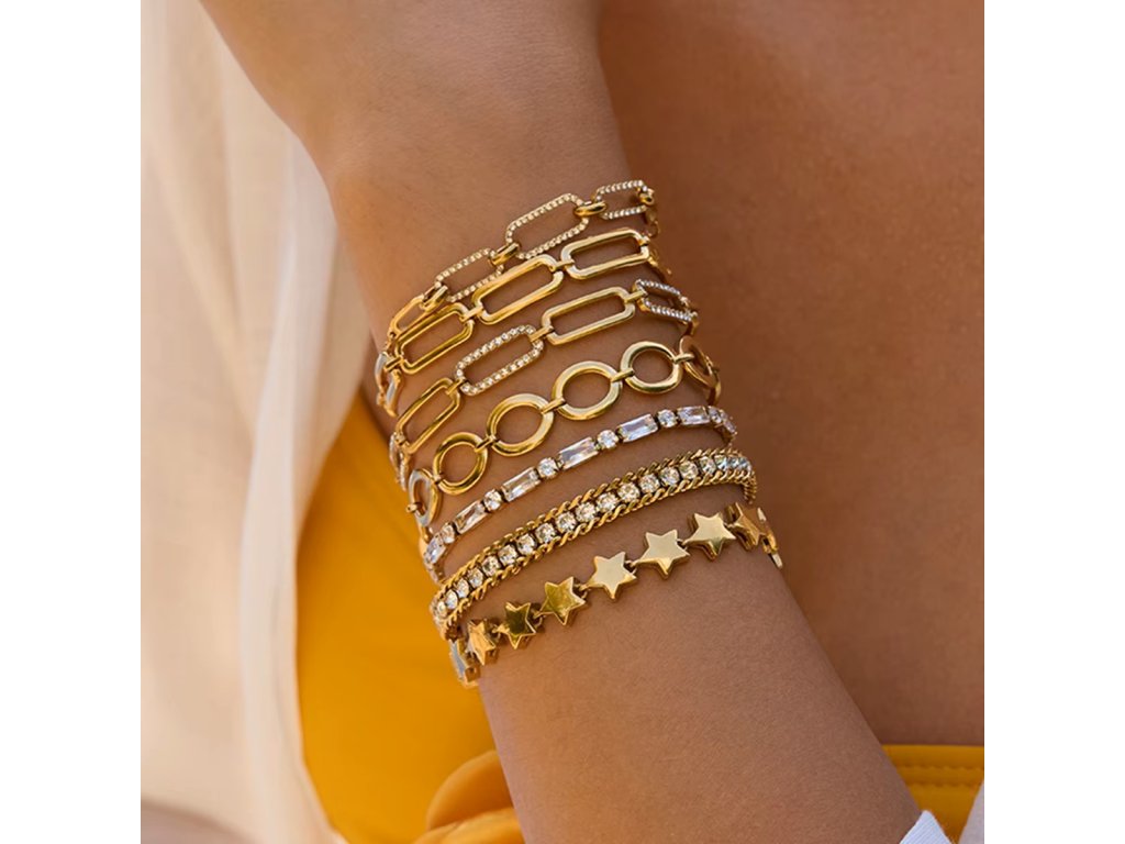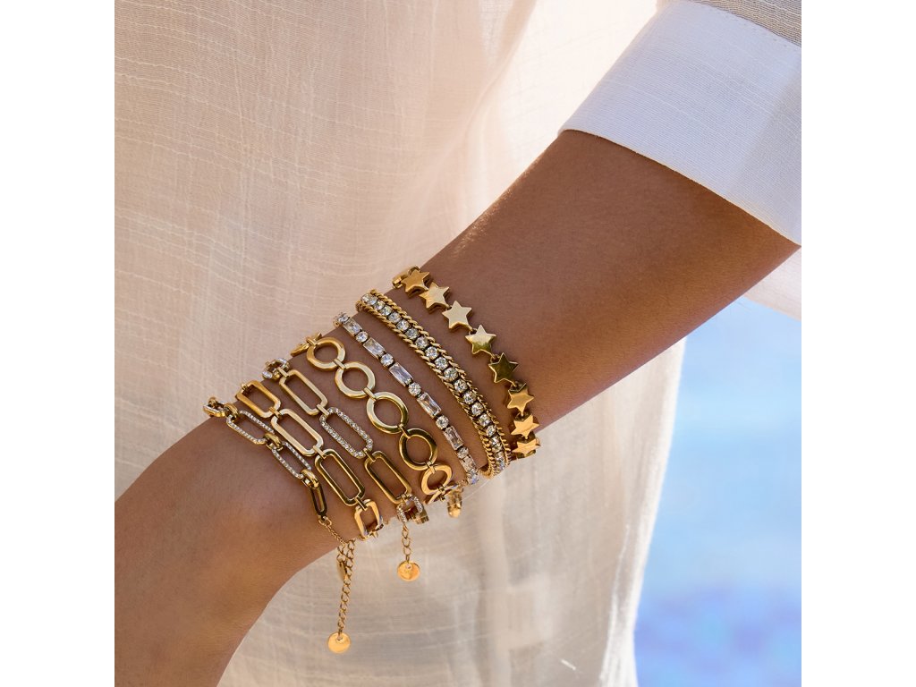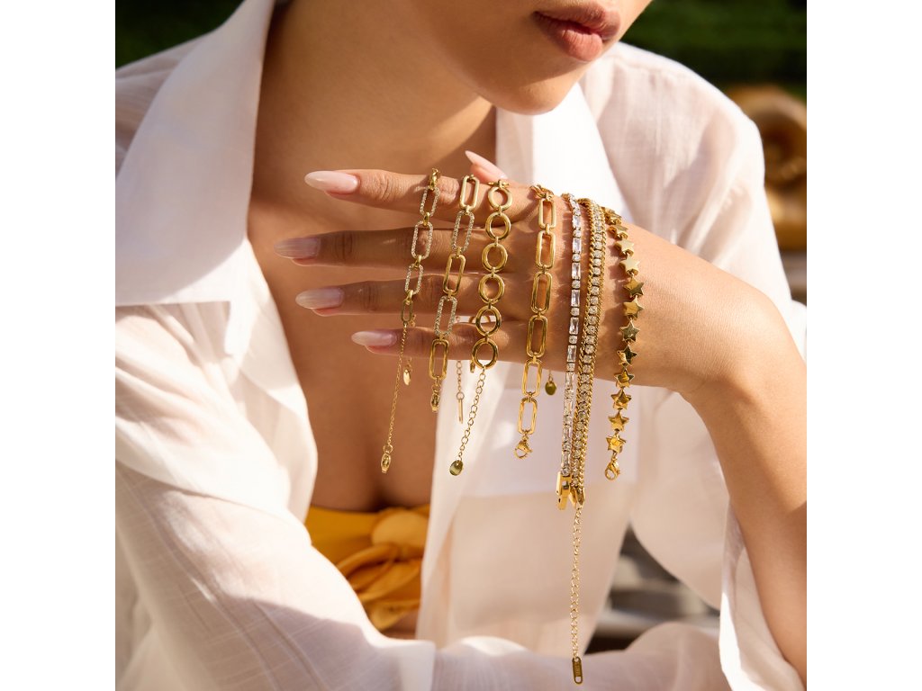 Základ tvoří hypoalergenní chirurgická ocel s povrchovou úpravou Elenys Signature Gold™ v odstínu 18k žlutého zlata. Náramek je voděodolný, barevně stálý a vhodný pro každodenní nošení.