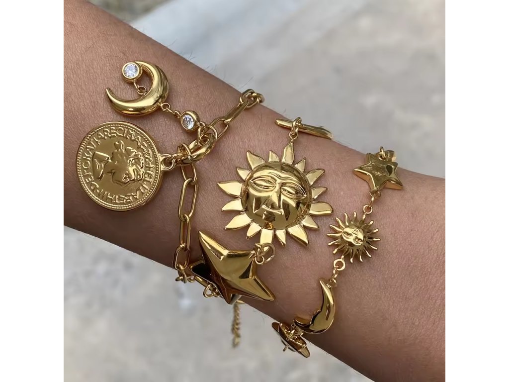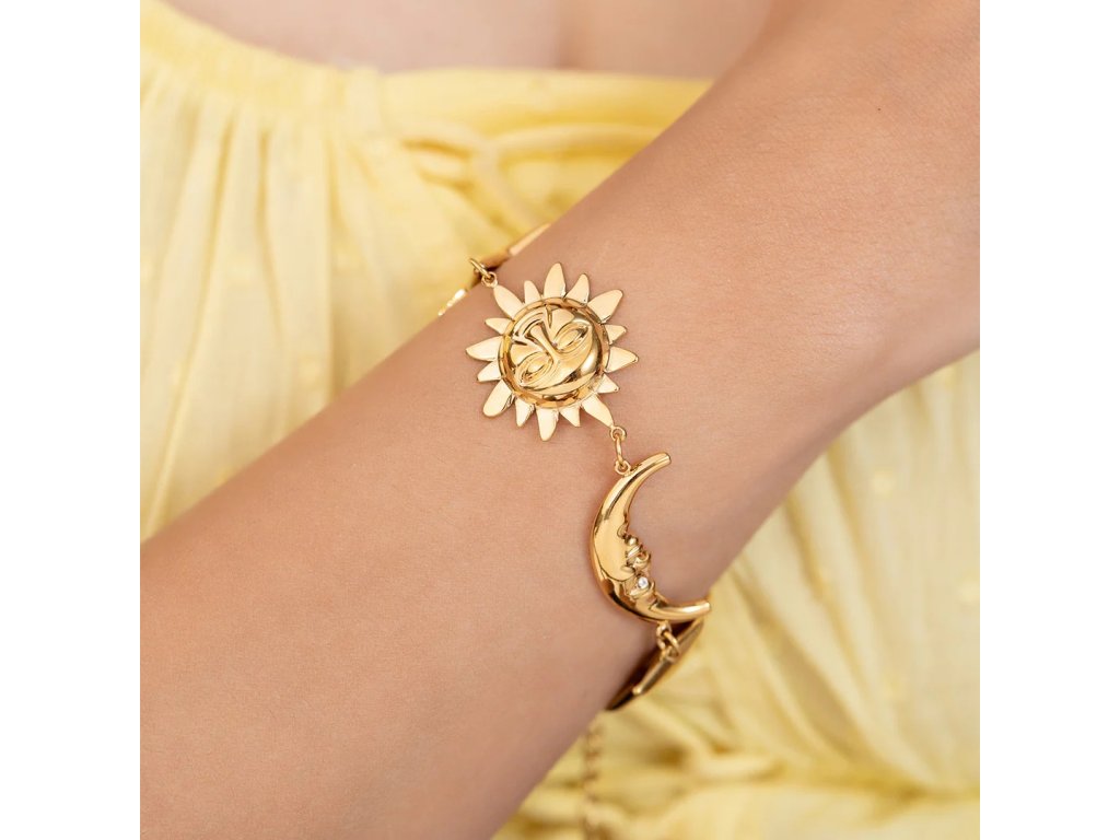 Detailní symboly dodávají náramku umělecký a nadčasový charakter. Výrazné slunce a měsíc vytváří jemnou hru světla při každém pohybu zápěstí.