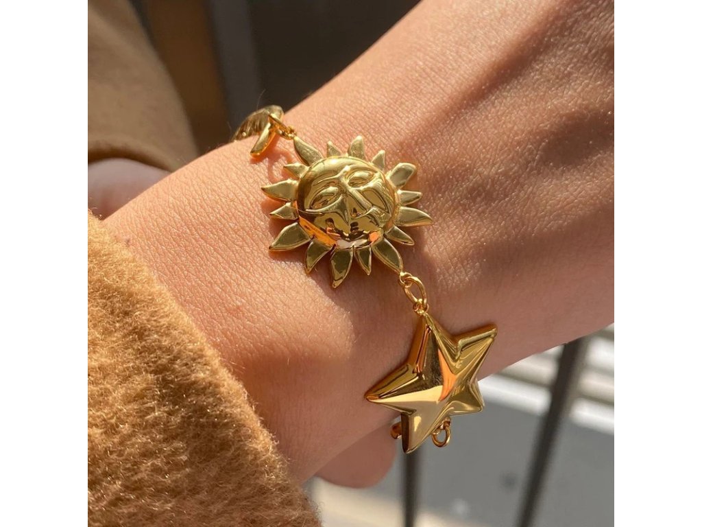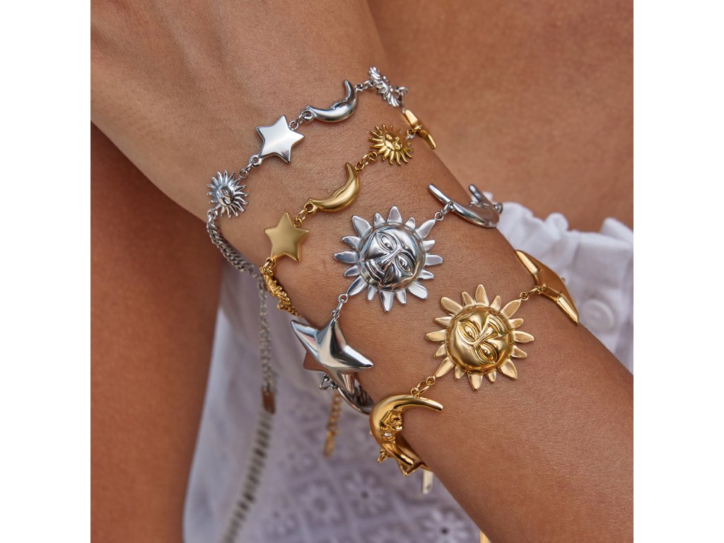 ELENYS Luna Stella je šperk, který působí jako ochraný talisman – tři symboly, každý se svým významem, propojené do jednoho výrazného náramku. Slunce přináší energii, hvězda zářivost a měsíc intuici. Výsledkem je elegantní, ženský a nezaměnitelný design.