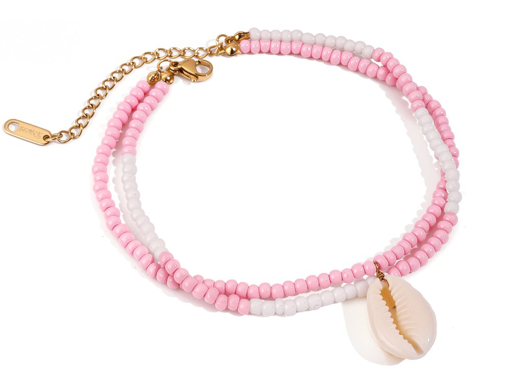 Dominantním detailem je přívěsek ve tvaru mušle cowrie, který jemně odkazuje na letní atmosféru a moře. Přívěsek je lehký a při chůzi se přirozeně pohybuje, aniž by působil rušivě.
