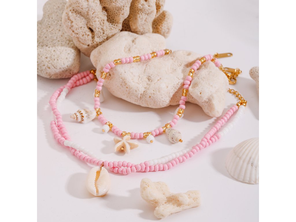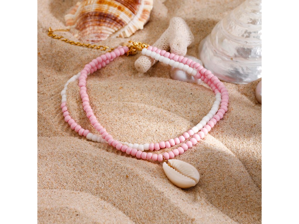 Dominantním detailem je přívěsek ve tvaru mušle cowrie, který jemně odkazuje na letní atmosféru a moře. Přívěsek je lehký a při chůzi se přirozeně pohybuje, aniž by působil rušivě.