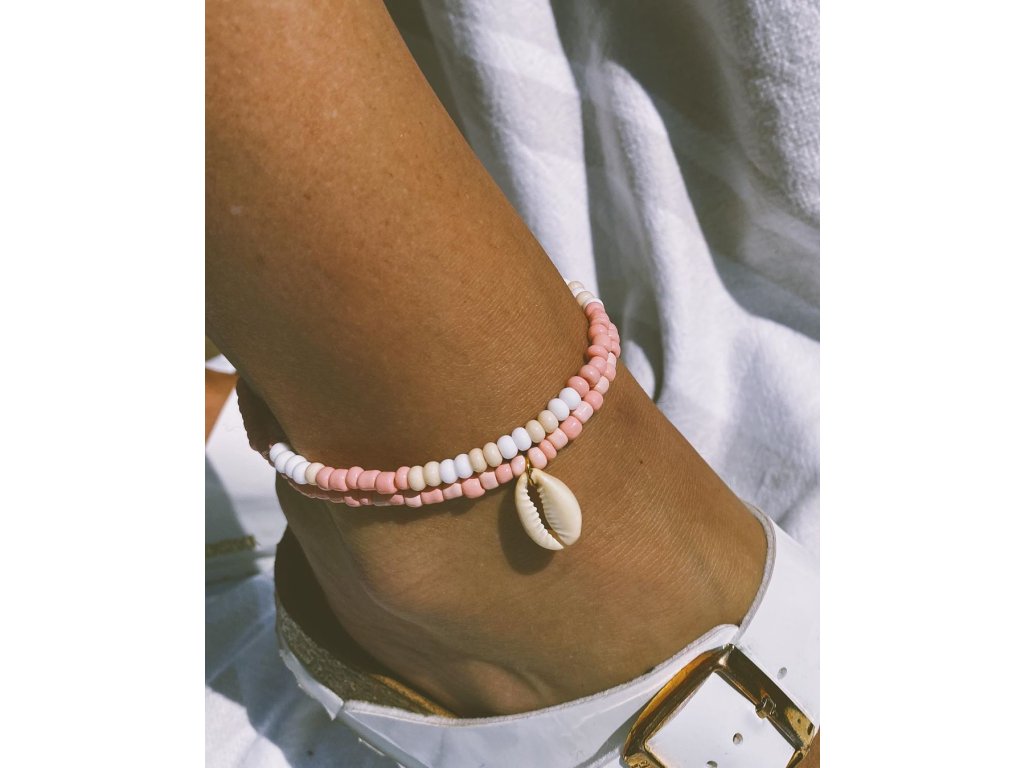 ELENYS Mareva je jemný letní náramek na nohu tvořený dvojitou řadou drobných korálků v růžovém a světlém odstínu. Barevná kombinace působí klidně a přirozeně a snadno se kombinuje s letním oblečením i dalšími šperky.