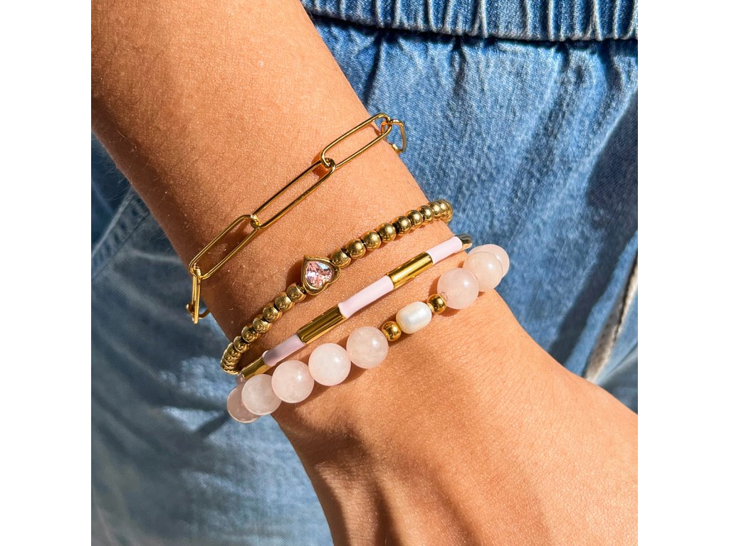 Náramek ELENYS Pink Amour tvoří drobné hladké korálky doplněné o srdce s růžovým broušeným zirkonem. Minimalistický a přitom výrazný detail, který krásně vynikne samostatně i v kombinaci s dalšími náramky.