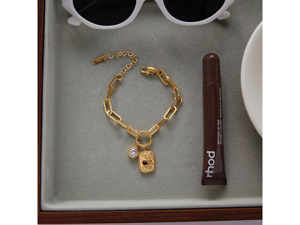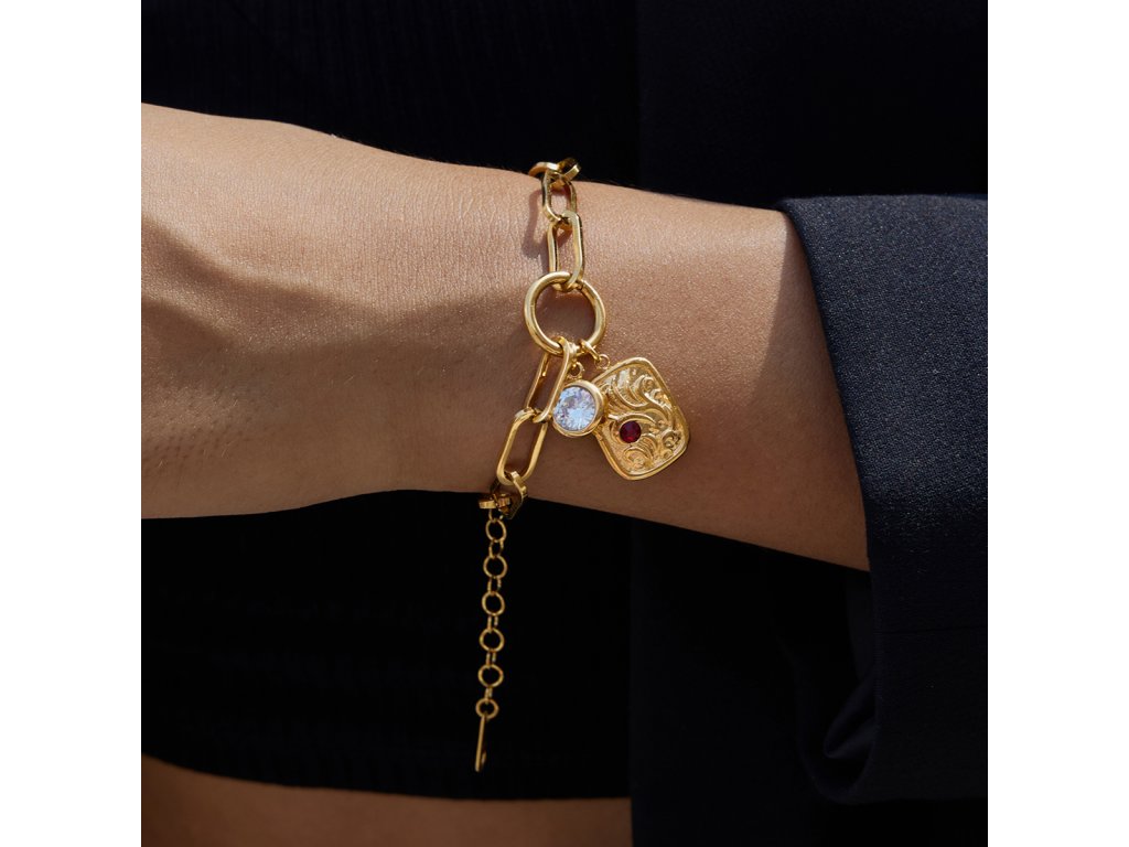 ELENYS Relic Chain je řetízkový náramek s výrazným reliéfním článkem, který působí jako drobný artefakt. Plastická struktura doplněná jemným zirkonem dodává šperku hloubku, zatímco čistý řetízek zachovává vyvážený a elegantní celek.