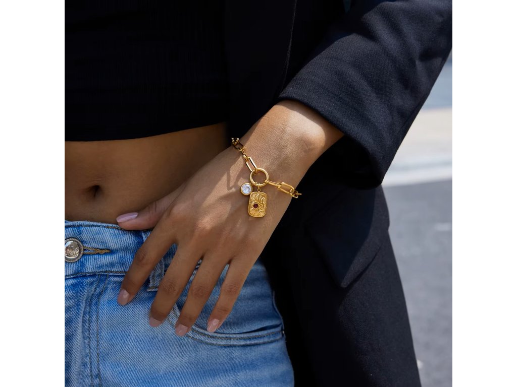 Reliéf připomíná starobylý symbol nebo osobní talisman. Zirkon zachycuje světlo s decentním třpytem, který podtrhuje detail, aniž by působil okázale. Náramek je výrazný, ale stále nositelný pro každý den.