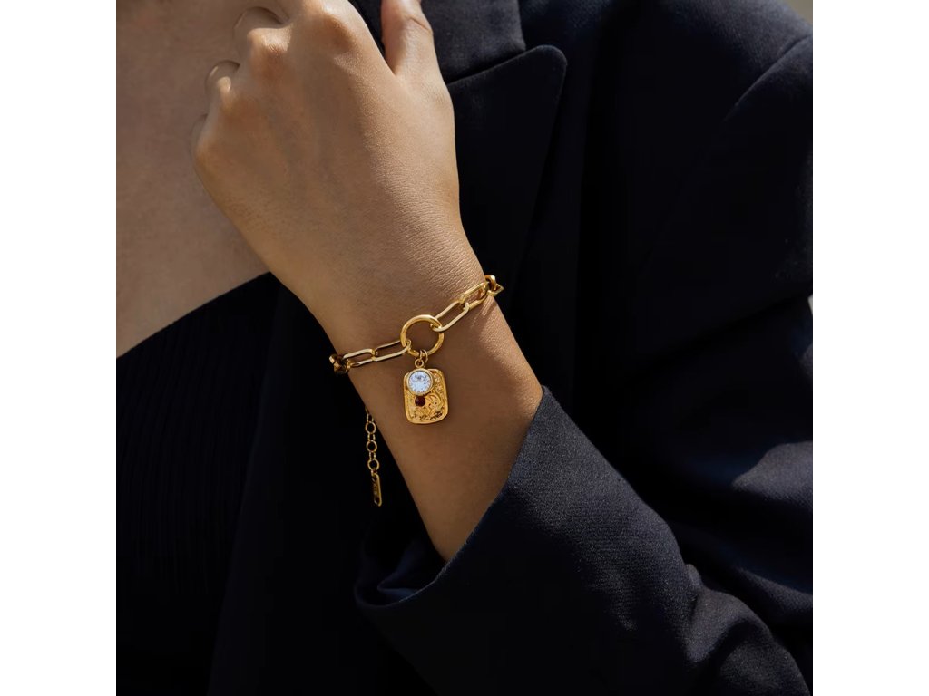 Reliéf připomíná starobylý symbol nebo osobní talisman. Zirkon zachycuje světlo s decentním třpytem, který podtrhuje detail, aniž by působil okázale. Náramek je výrazný, ale stále nositelný pro každý den.