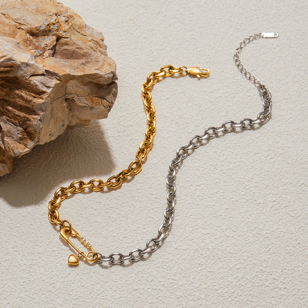 Ikonický motiv bezpečnostního špendlíku s jemným srdíčkem a třemi jiskřivými kamínky. Dvoubarevné provedení (18k pozlacení + ocelový tón) dodává náramku moderní kontrast.